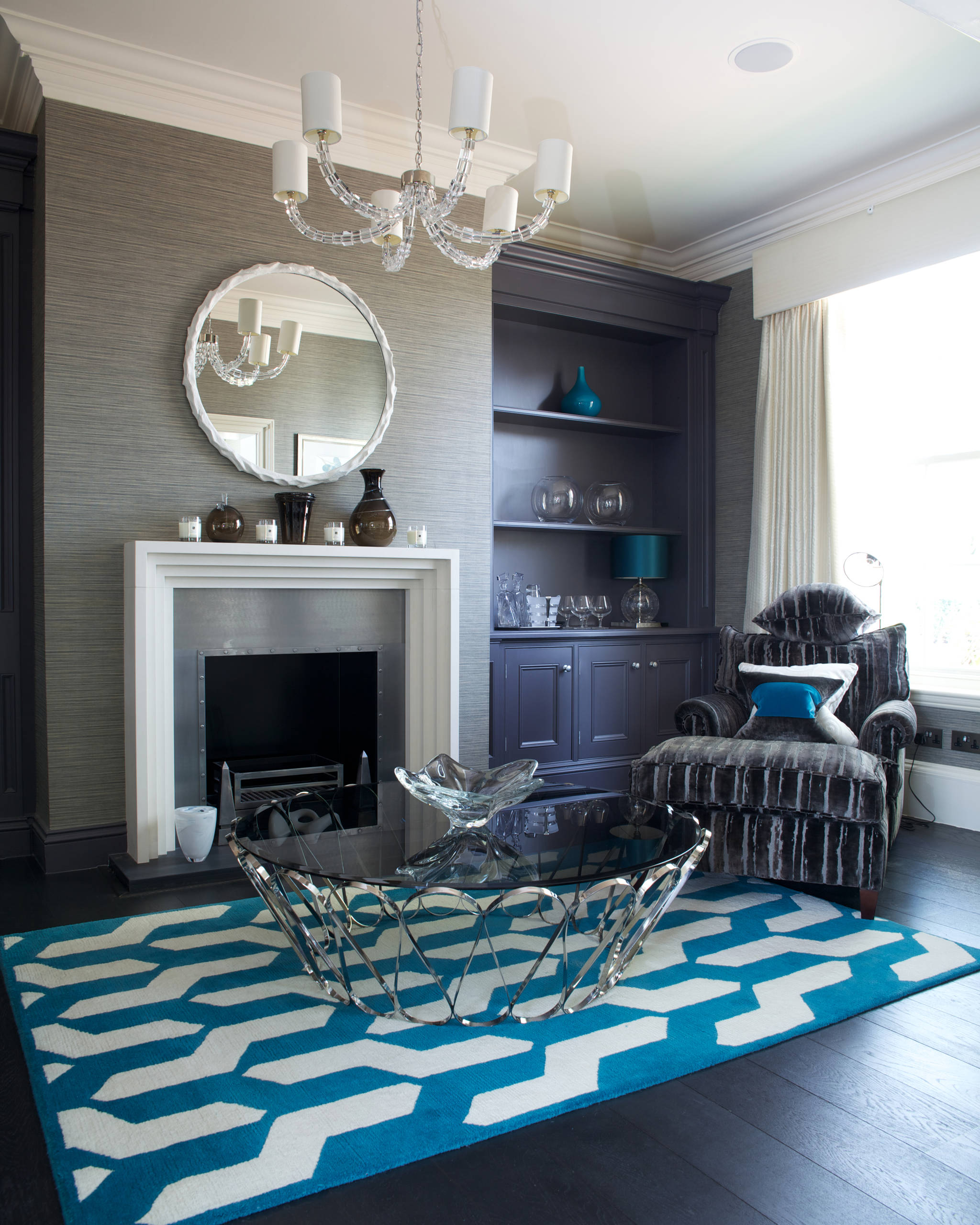 This circular mirror with a pared-back frame is an exercise in restraint. It resists the urge to fill the entire space and simply reiterates the white outlines used elsewhere – in the rug, the chair, the pelmet and the fireplace. It’s a great example of using a mirror to reflect your décor theme in the subtlest of ways.