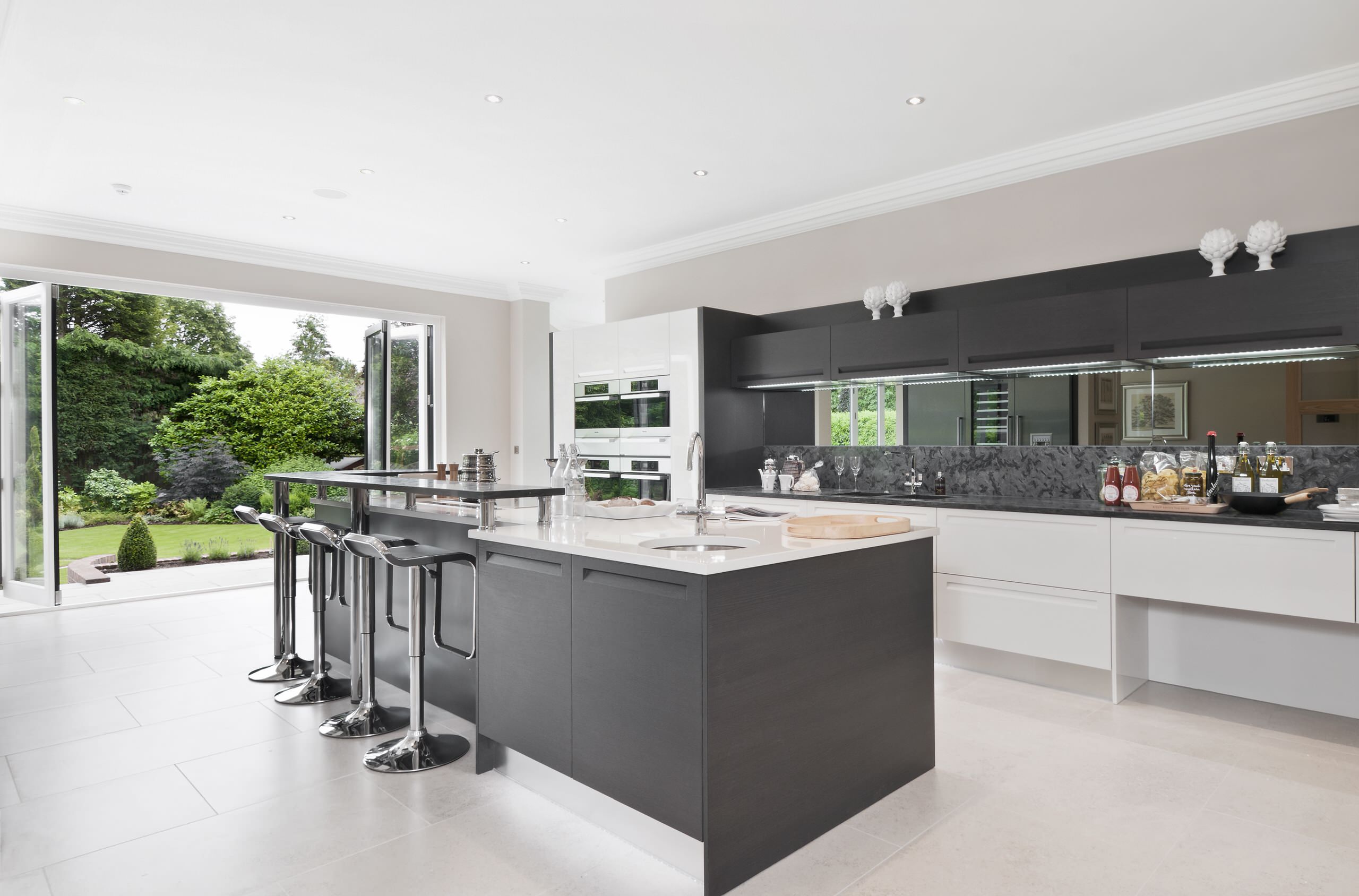 This kitchen extends the worktop up into a splashback, but then adds a ribbon of mirror glass at eye level. It feels glossy and contemporary, and creates the illusion that an extra space awaits beyond the worktop – rather like a restaurant kitchen hatch.