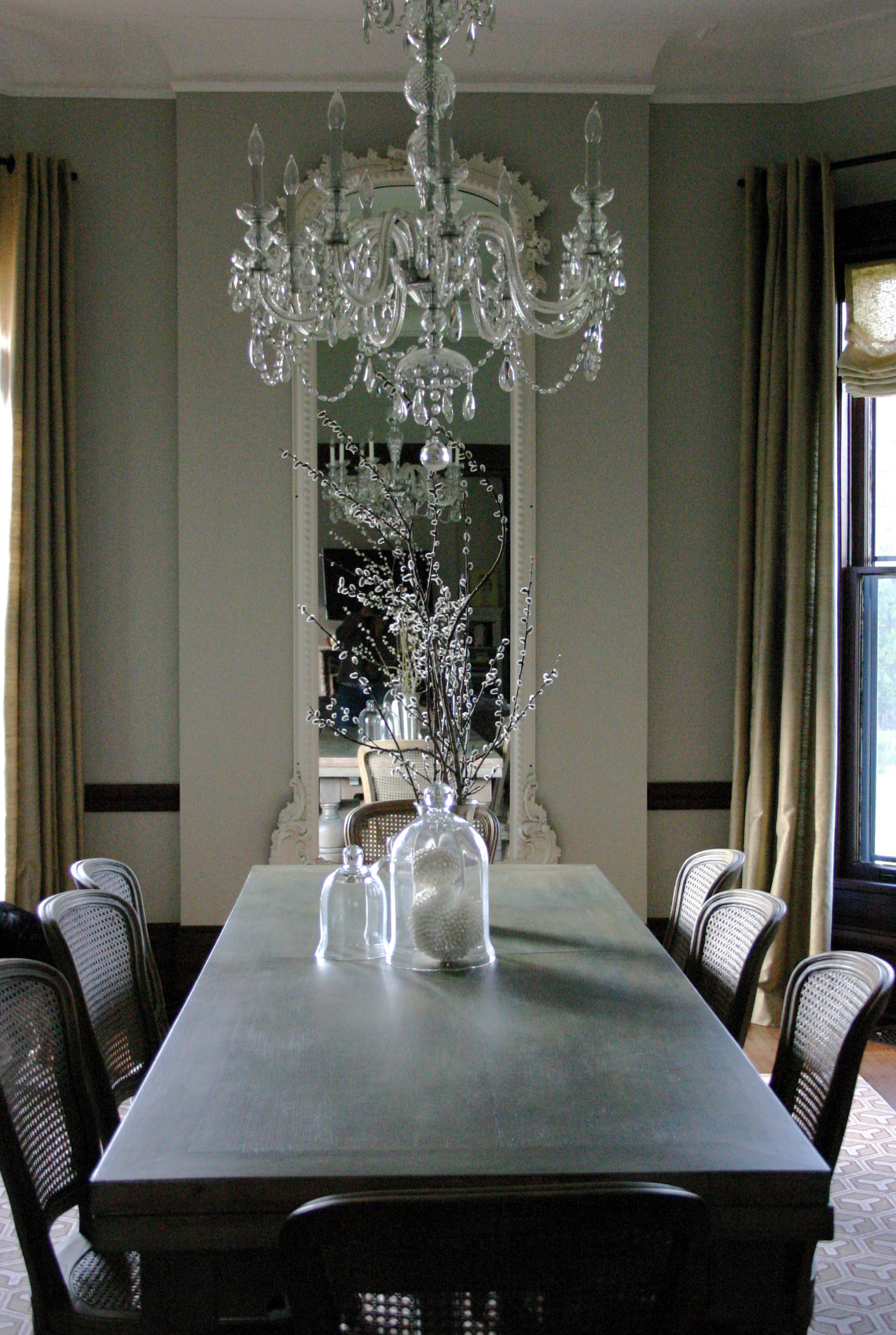 Mirrors can come in unusual sizes if they’re salvaged from hotels or department stores. This tall mirror has impact in a dining space, reflecting the simple glass centrepiece. Its tall, skinny dimensions add gravitas to the symmetrical arrangement and will enhance the light emanating from the chandelier and candles when guests arrive.