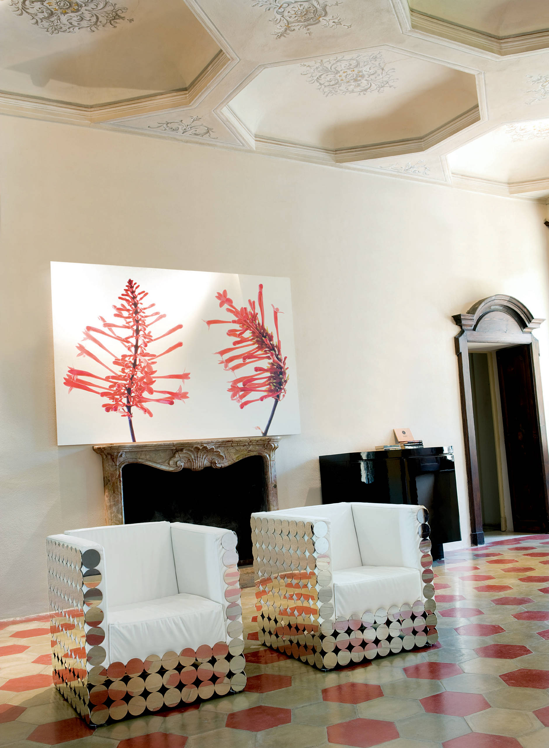 Mirrors over the mantel? Pah – so last century. This cool interior replaces the overmantel with an artwork and adds mirror glass in a pair of Sixties-style chairs instead. Whether you’re decking out a huge room or a more modest abode, this shows how turning the tables can refresh your space.
