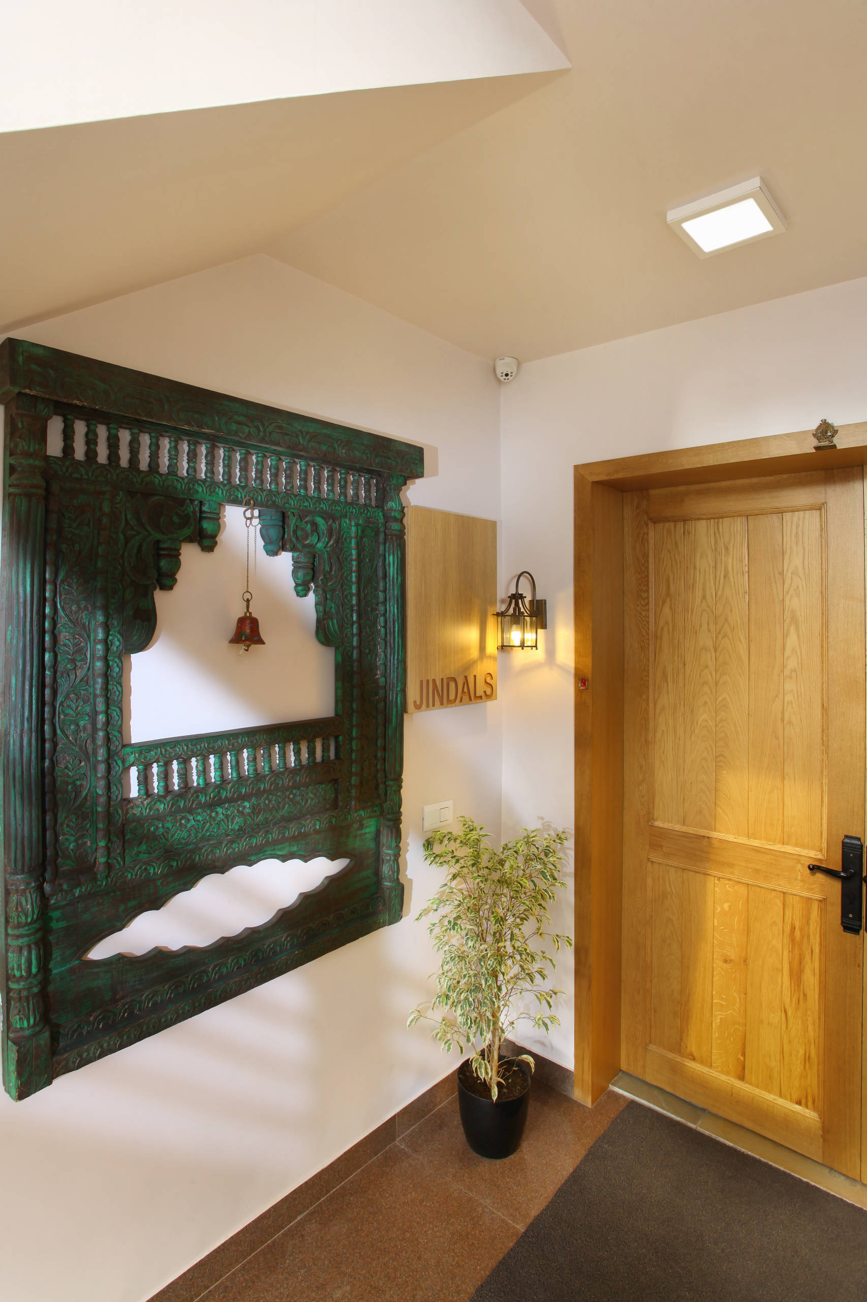 The architects have blended design styles, mixing ethnic details and natural finishes with a contemporary aesthetic. The entrance is marked by a simple wood door and name plate, with an antique jharoka and vintage-style wall sconce grabbing attention.