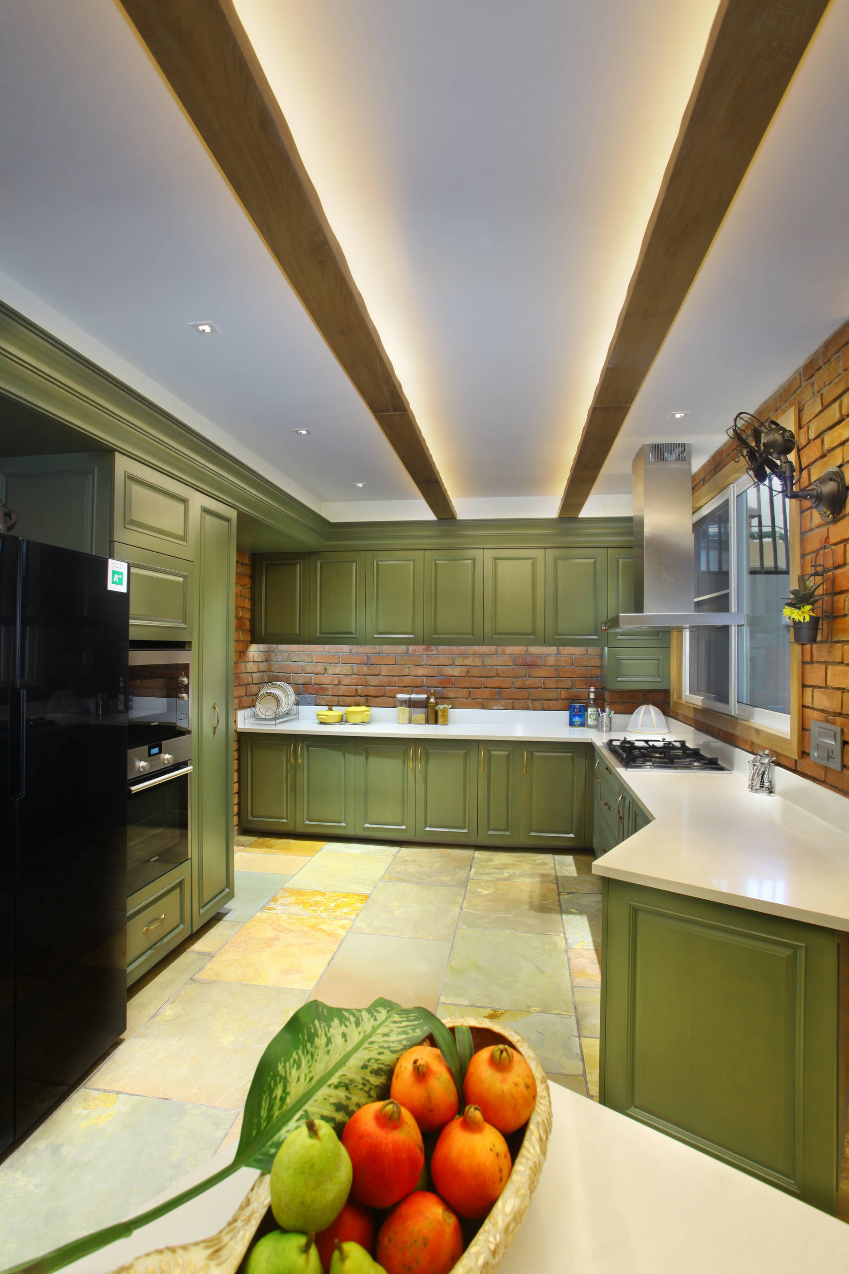 The moss-green panelled cabinetry and sleek white countertops complement the rusticity and hue of the exposed-brick kitchen backsplash. “The layout of the kitchen was designed keeping functionality as the most important factor. The open plan allows for ample circulation and we made sure to add enough light sources, storage and work space,” he adds.