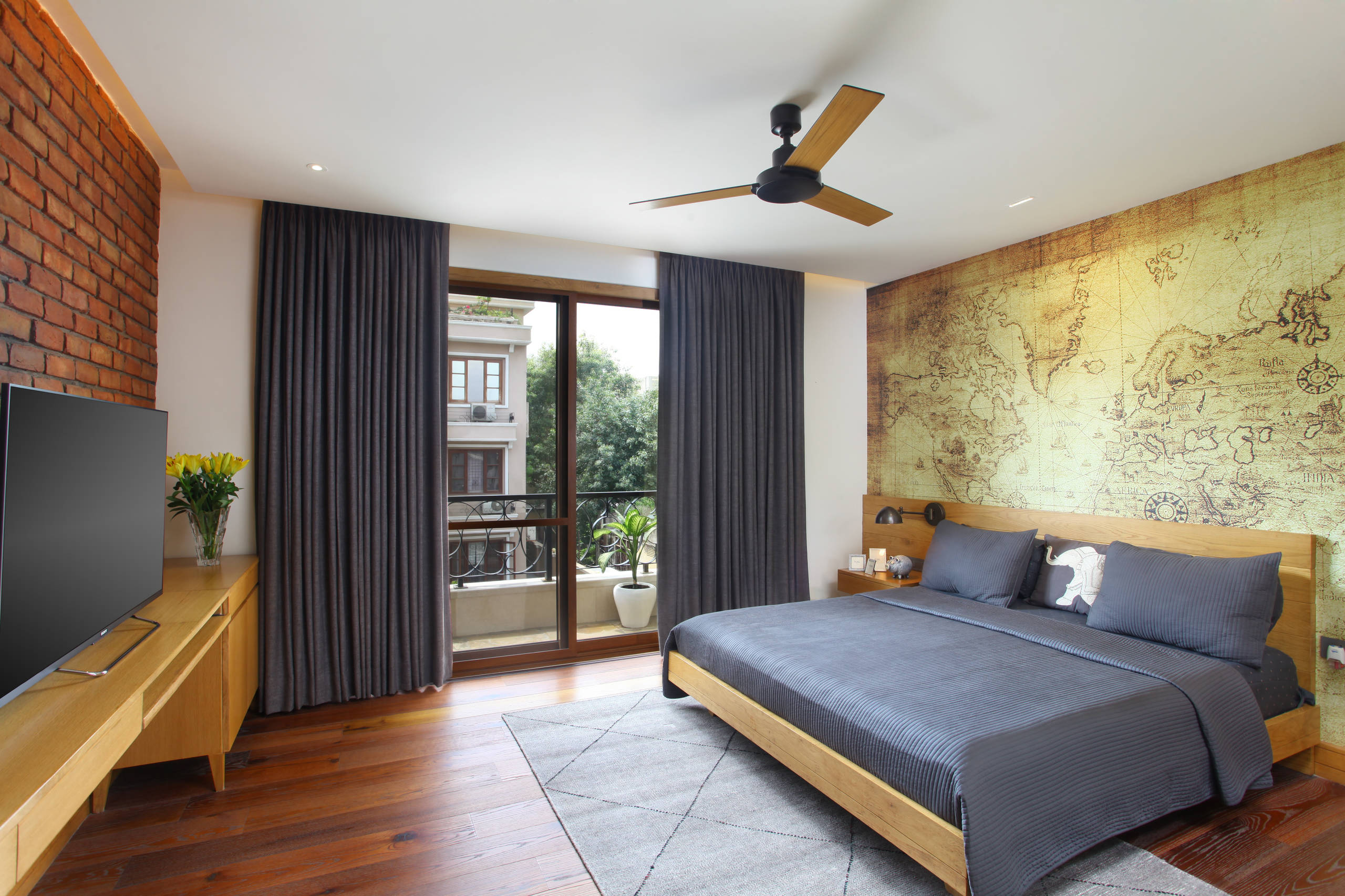 At the opposite end of the home, across from the living room, is the son’s bedroom, which features a travel-inspired theme. “We added a world map with a vintage feel to the wall behind the bed,” Bansal says. An exposed brick wall and dark wood panel floors add to the rustic vibe.
