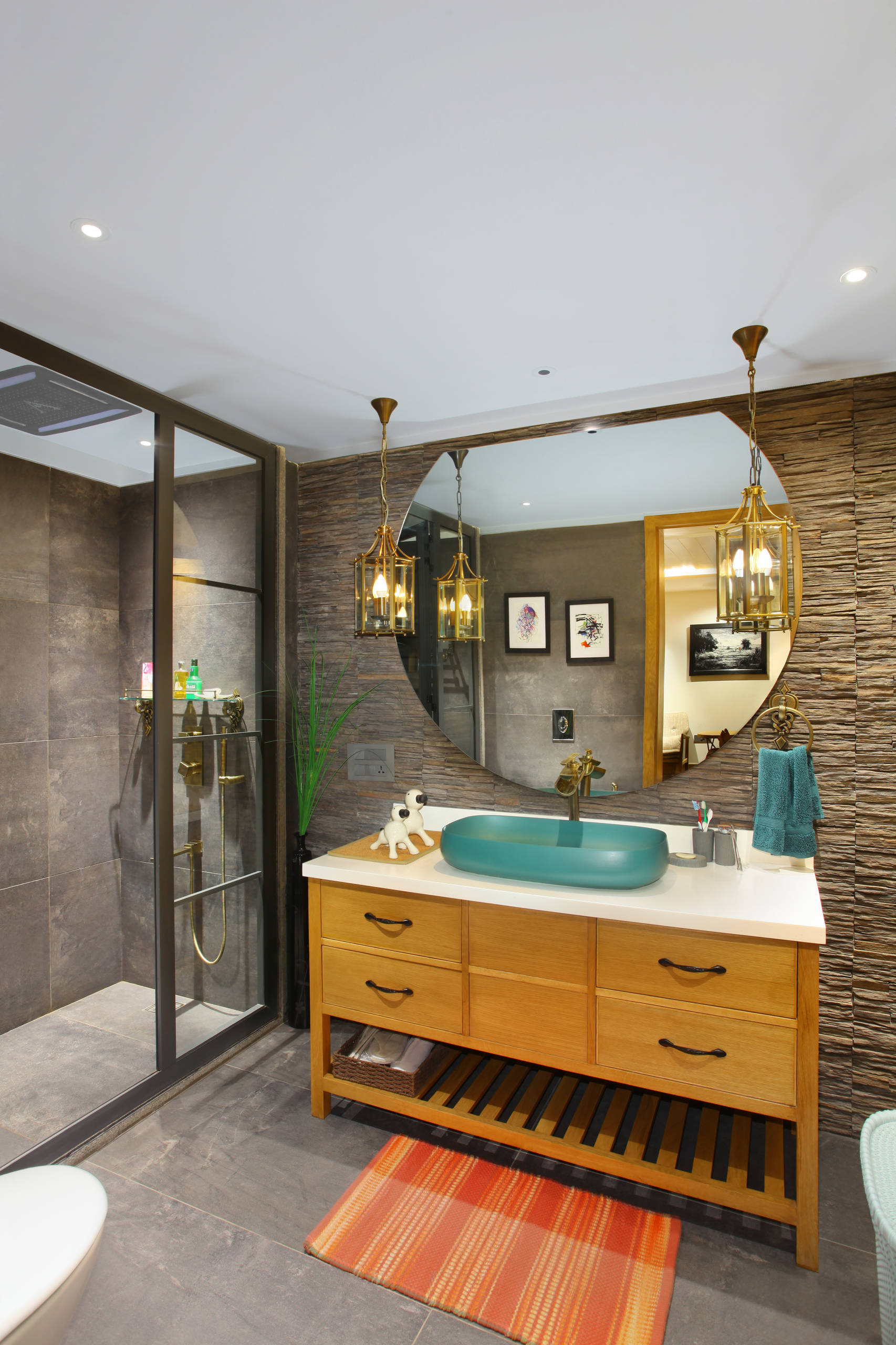 In the attached bathroom, a circular mirror is paired with a sleek wooden vanity. Adding a pop of colour to the muted palette is a bright blue vessel sink. Rustic wall tiles and vintage-inspired pendant lamps add interest and texture.
