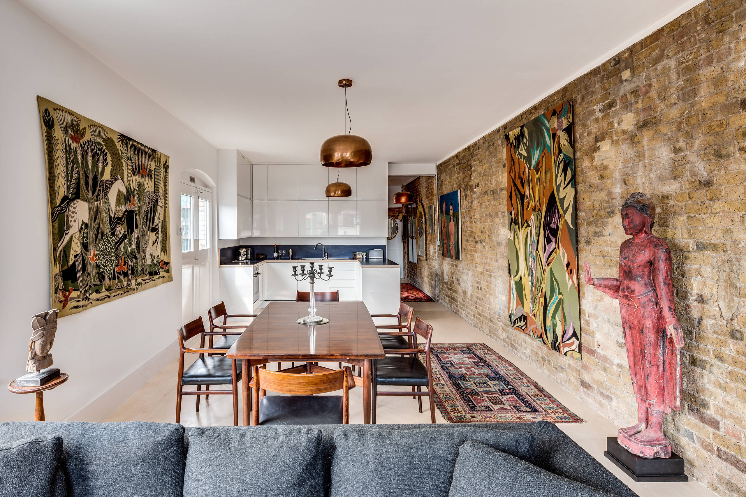 During the redesigning of this apartment, the designer brings in brick to use on an accent wall. This wall stands as a perfect backdrop for showcasing the collection of art pieces owned by the homeowner. The wall is left unpolished, and its continuation into the length of the house adds the illusion of more space.