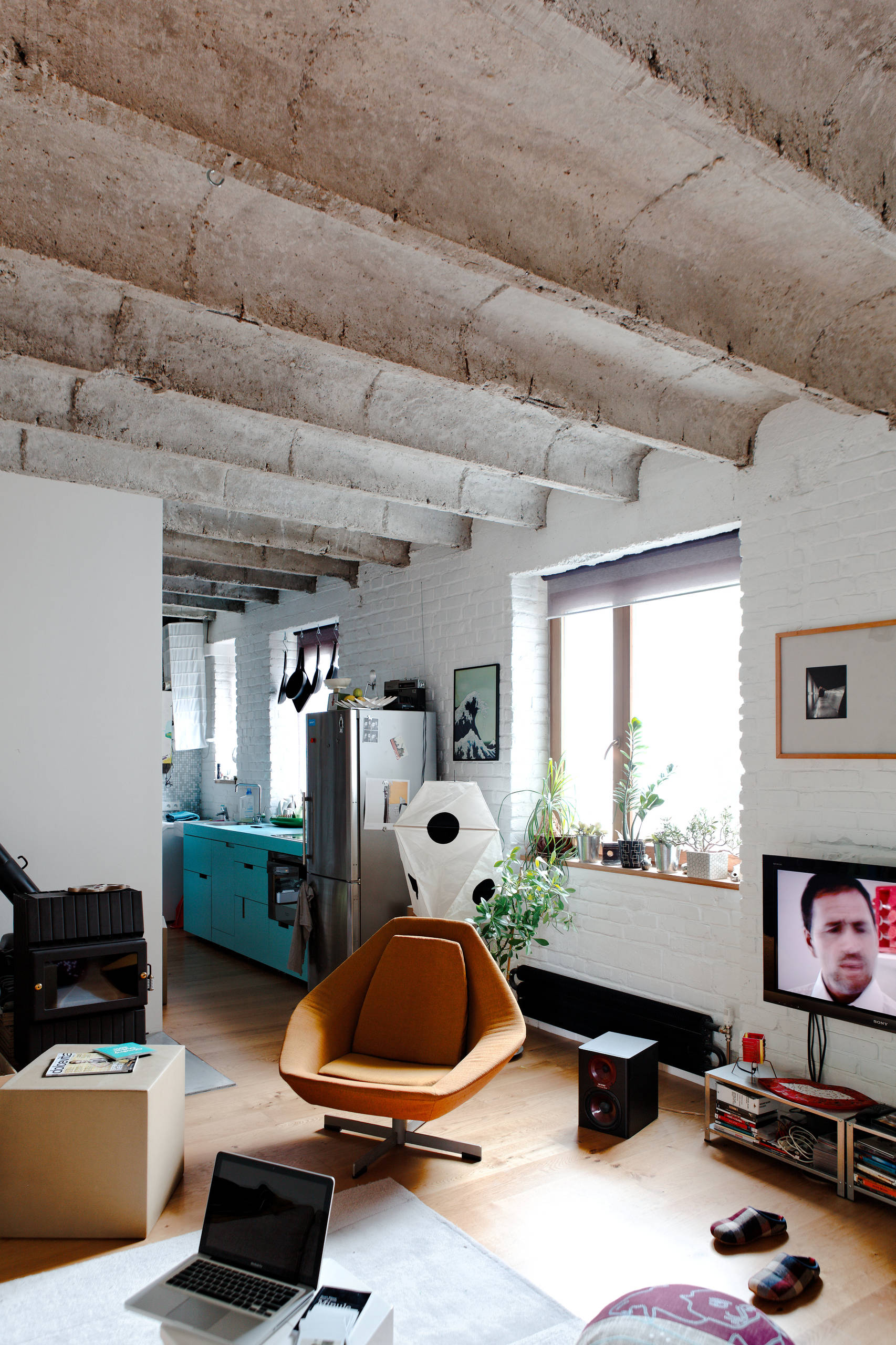 The designer models his own open plan apartment with a cemented ceiling and exposed brick walls painted in white. The rough exposed surfaces contrast with the smooth wooden floor and the partition wall. The whole space has an industrial, loft-like appeal.