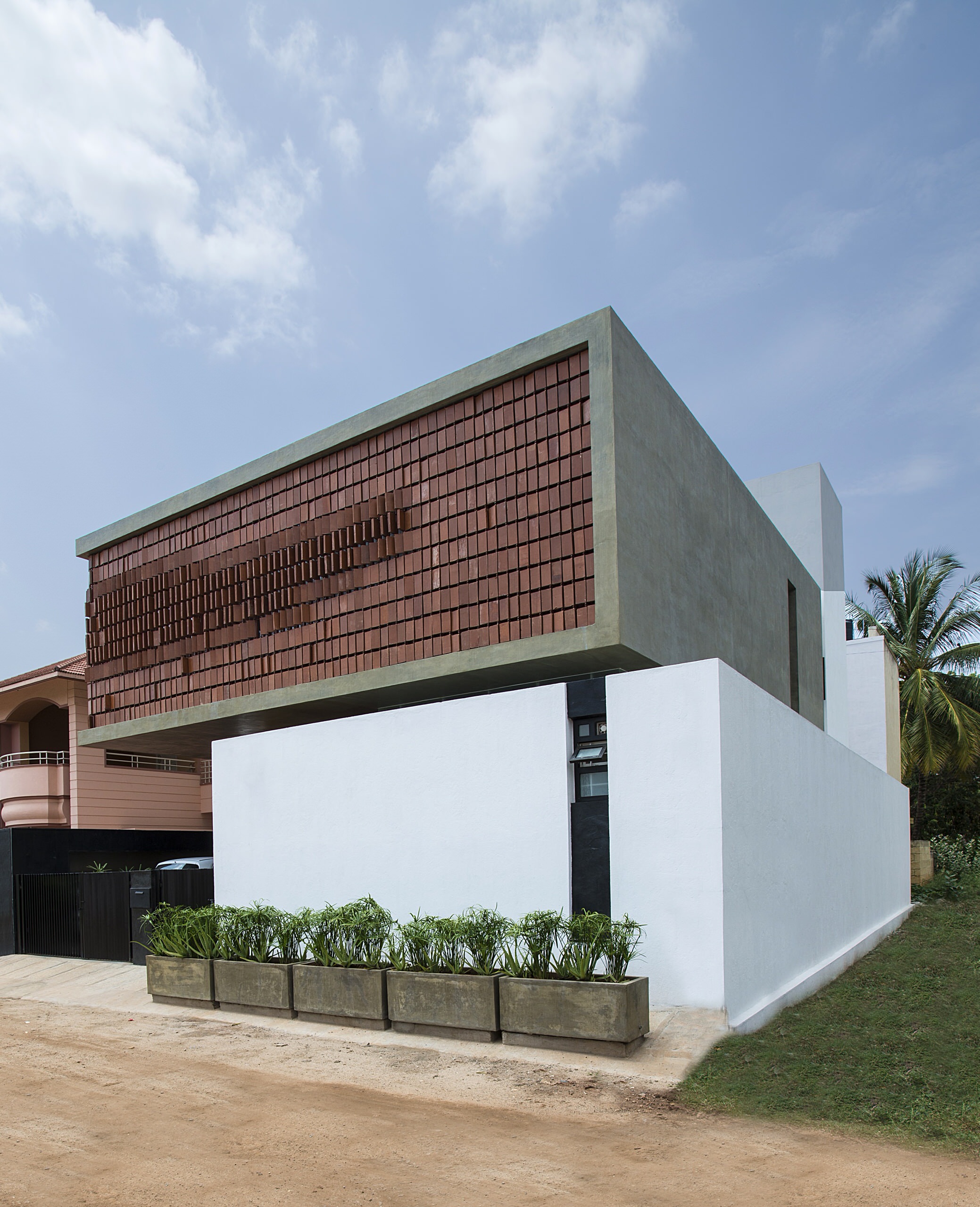 An unfamiliar yet ingenious use of brick tiles can be seen in this house by Architecture Paradigm. A series of weatherproofing clay tiles are used both vertically and horizontally to maintain privacy yet to allow in filtered light into the house. This textured surface on the facade reinforces the introverted behaviour of the home.
