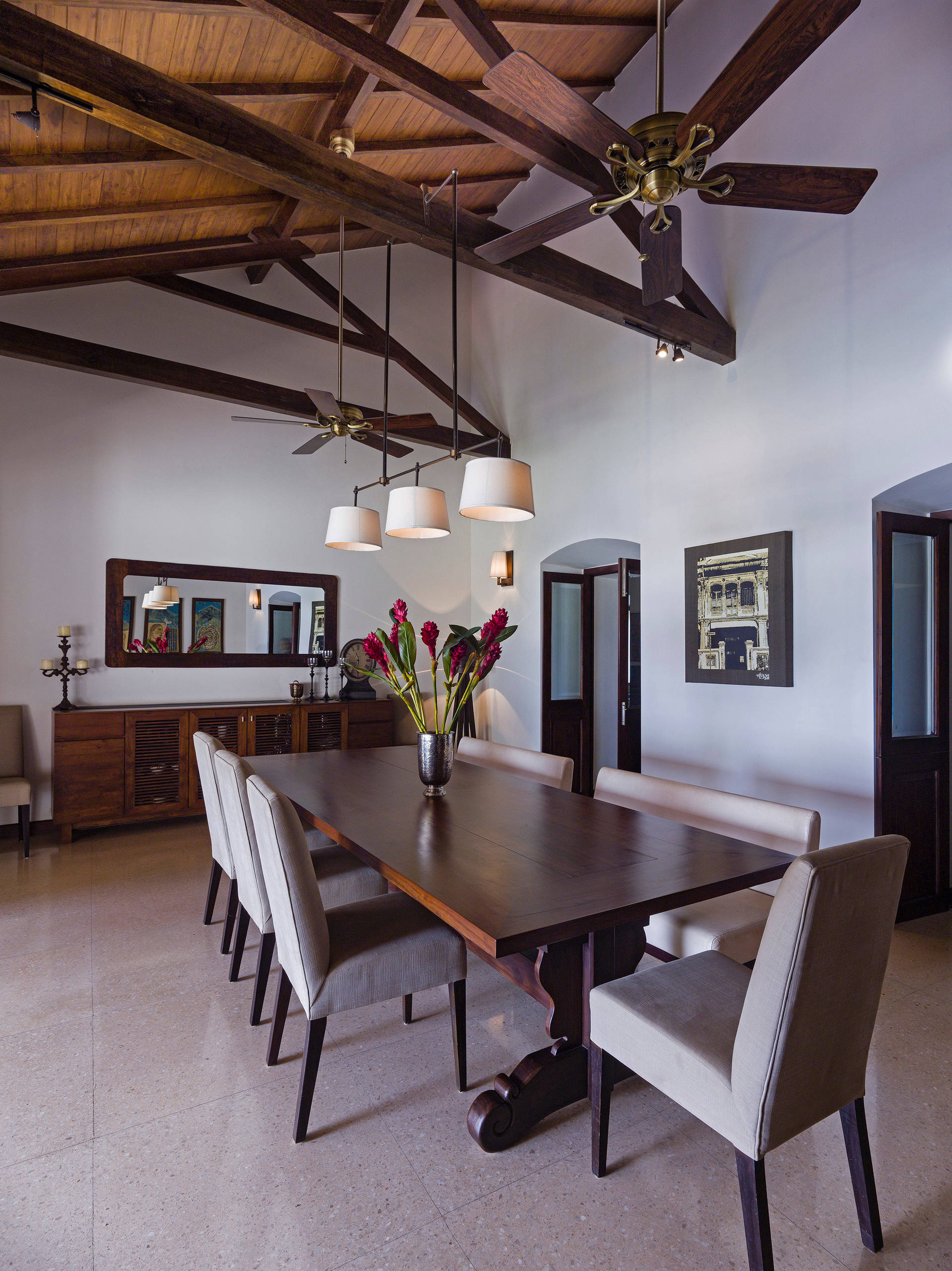 The dining room has a gabled roof and is characterised by sleek, modish furniture, an old-world wooden ceiling and colonial-inspired segmental arches.