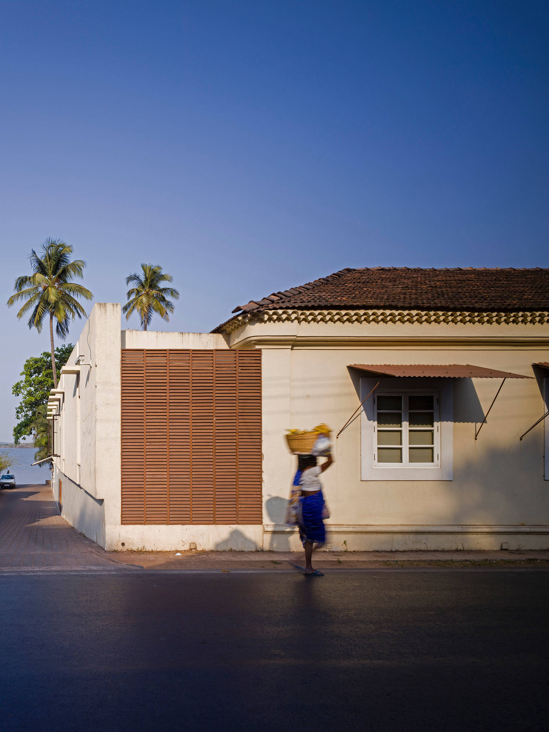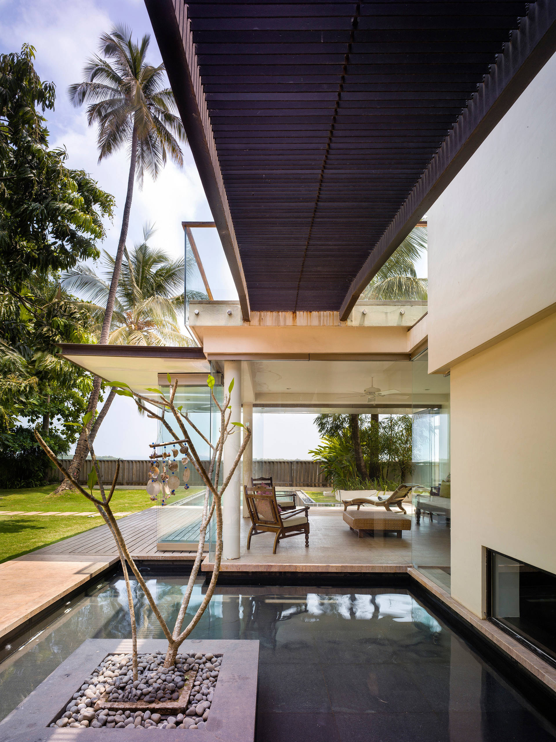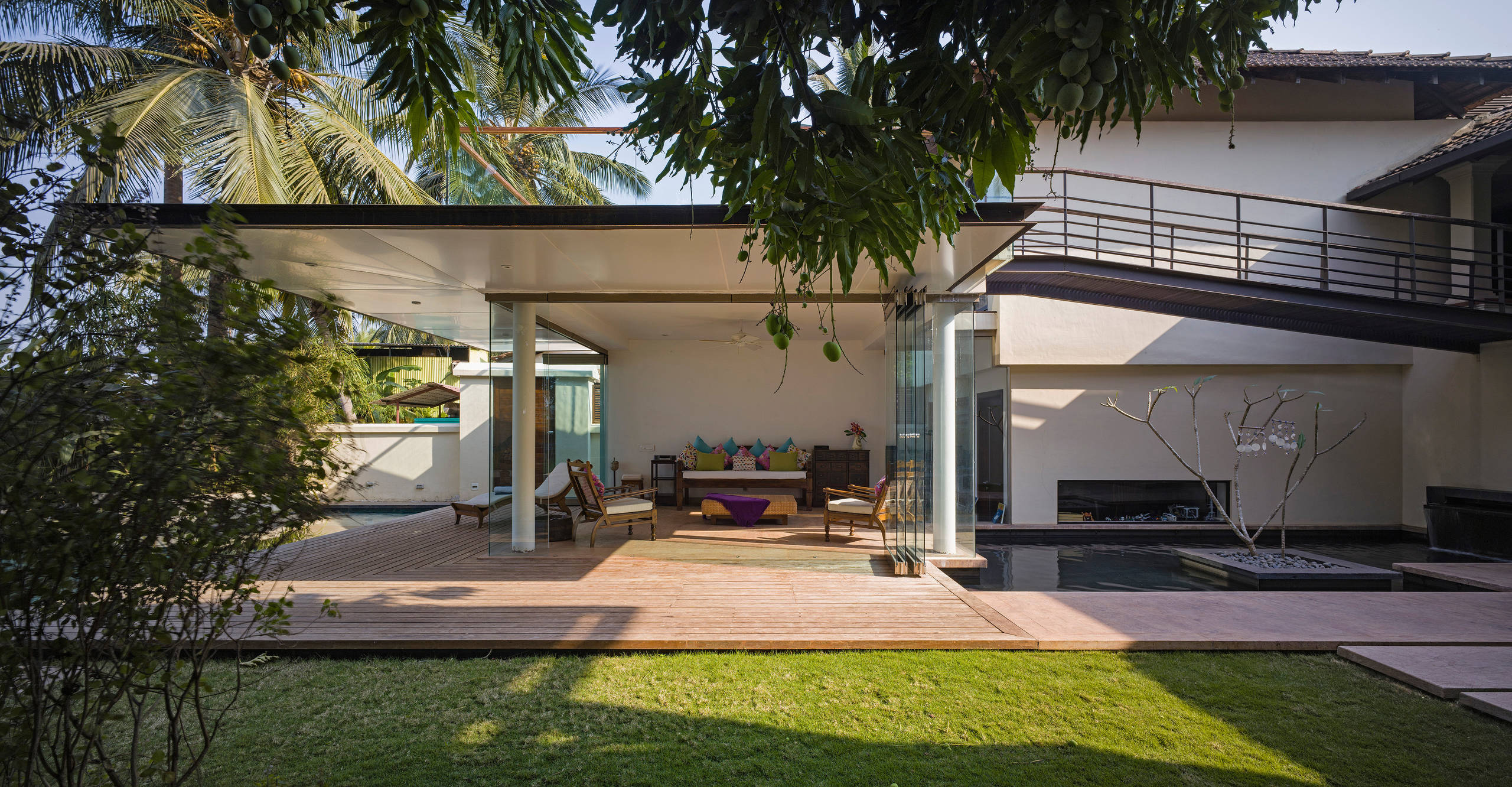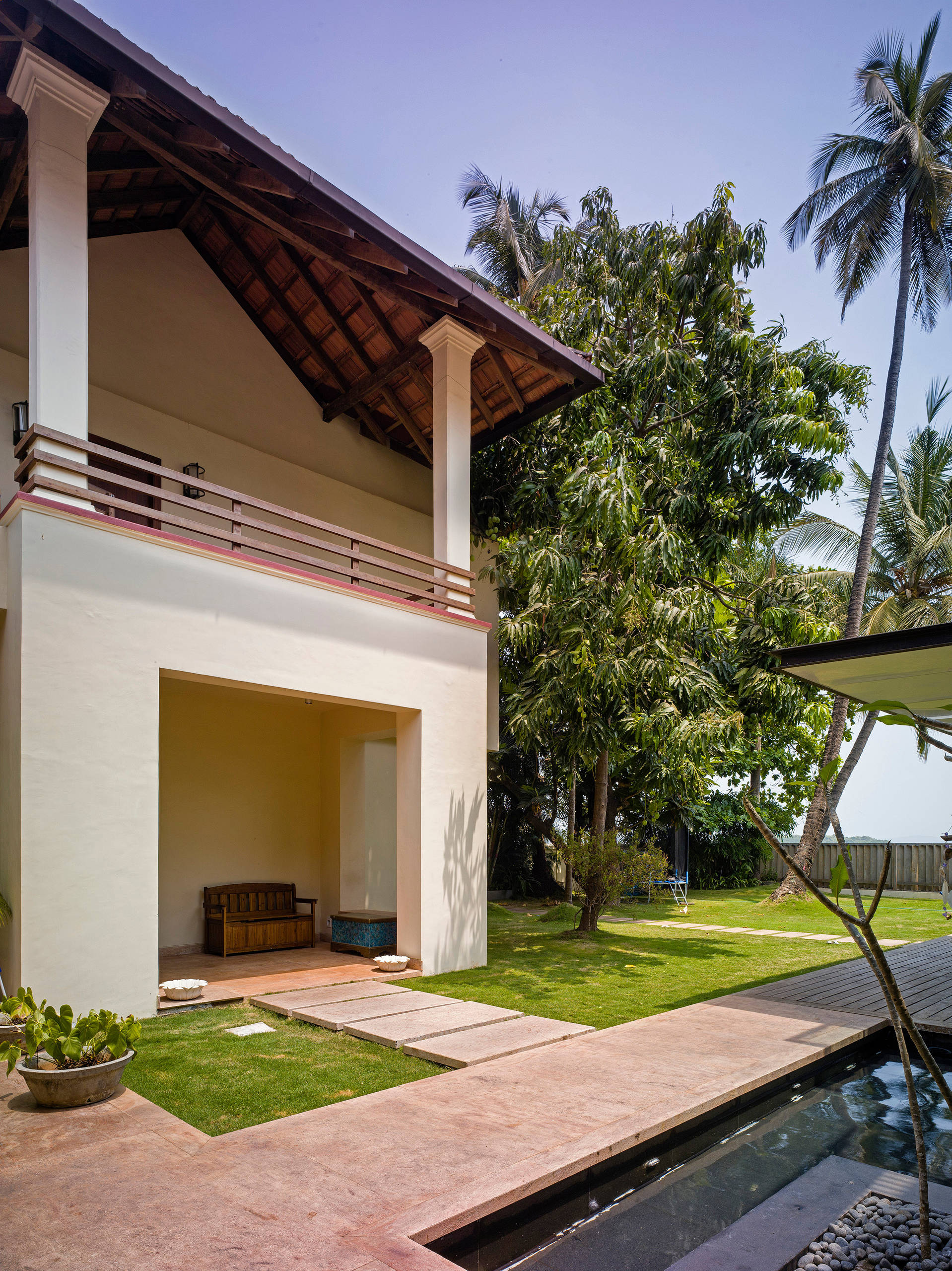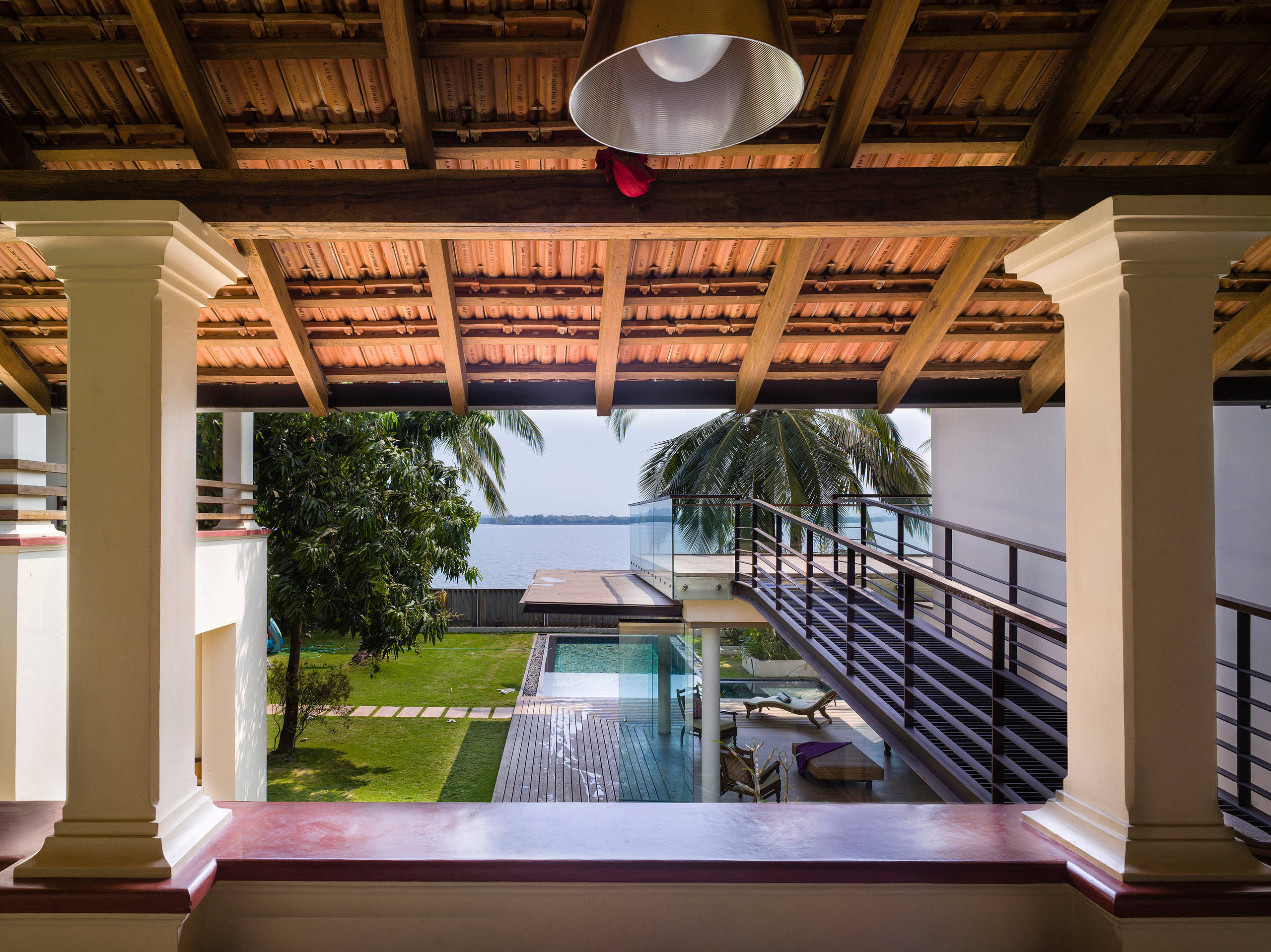 An overhead metal-slatted bridge connects the house to the terrace on the roof of the extension, which allows a generous view of the Mandovi river.