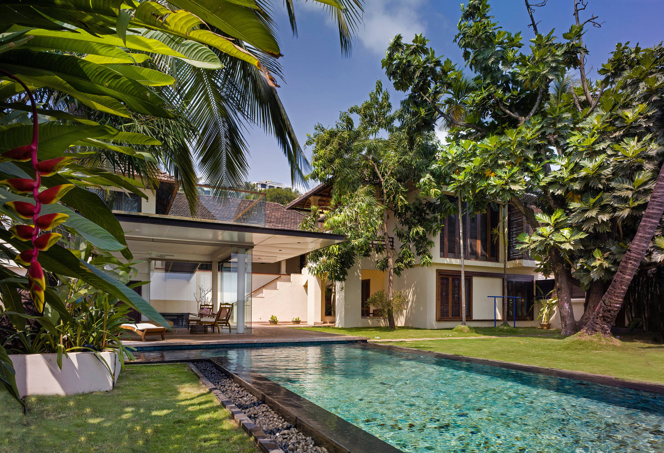 “Our client had the desire to convert a dilapidated two-storey heritage structure into a luxury six-bedroom riverside residence. The design brief entailed retaining and restoring as much of the original heritage structure as possible and adding an extension constituted of indoor and outdoor spaces that take advantage of the proximity to the Mandovi River,” says Raya Shankhwalker of Raya Shankhwalker Architects.