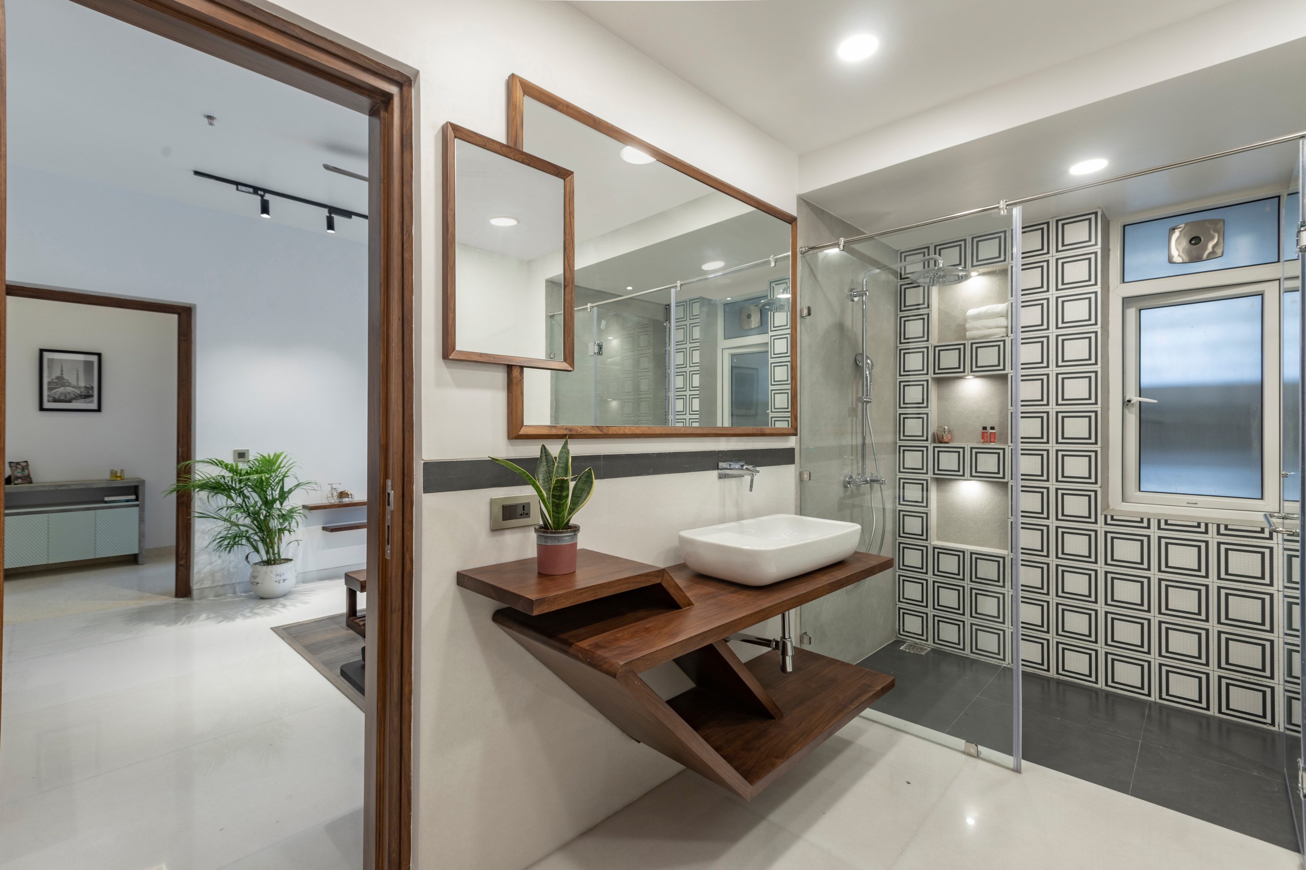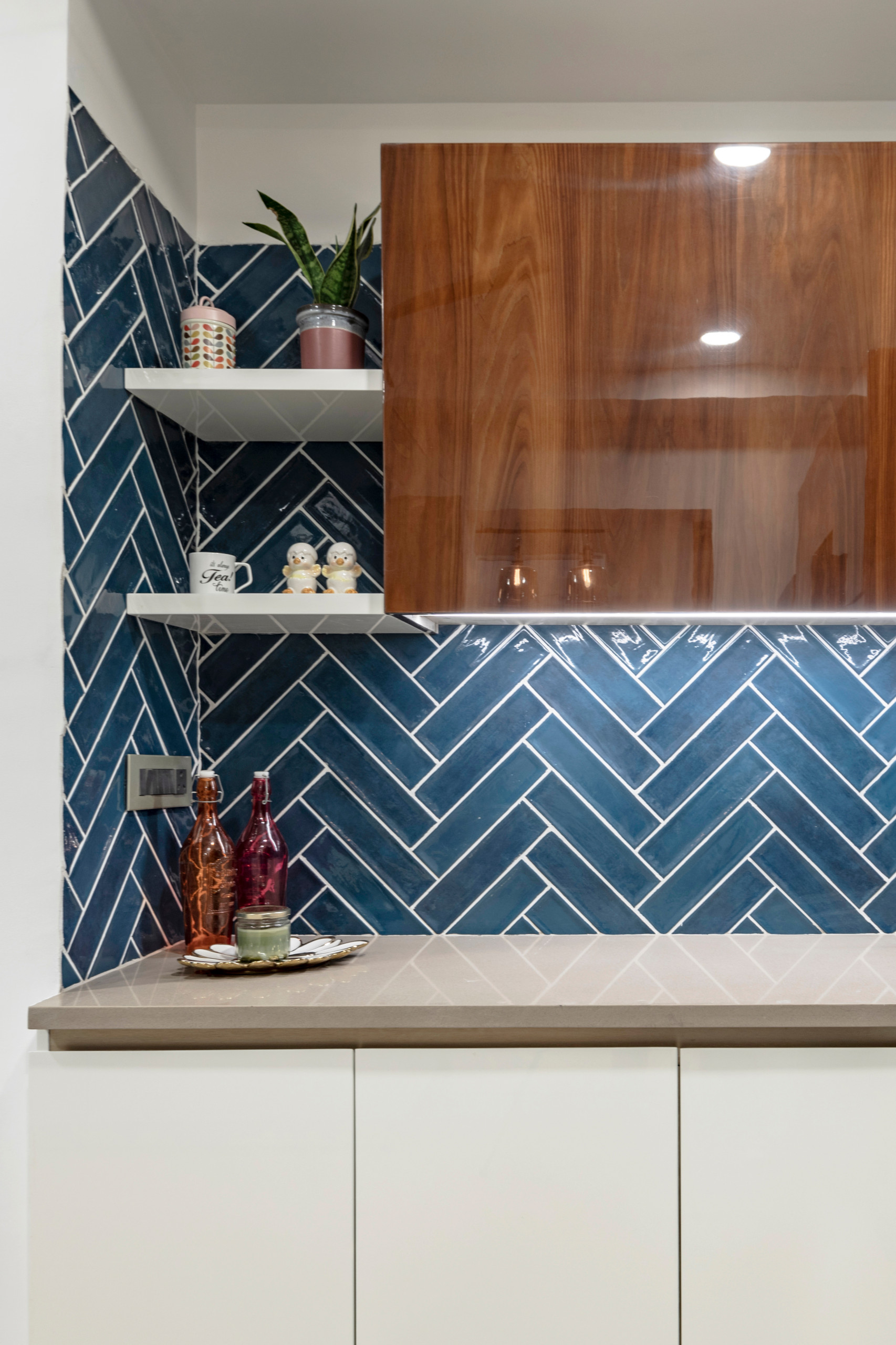 Glossy deep-blue subway tiles have been used in certain areas, including the backsplash. The dark veneer floating cabinet and light beige tiles on the counter add to the lustre.