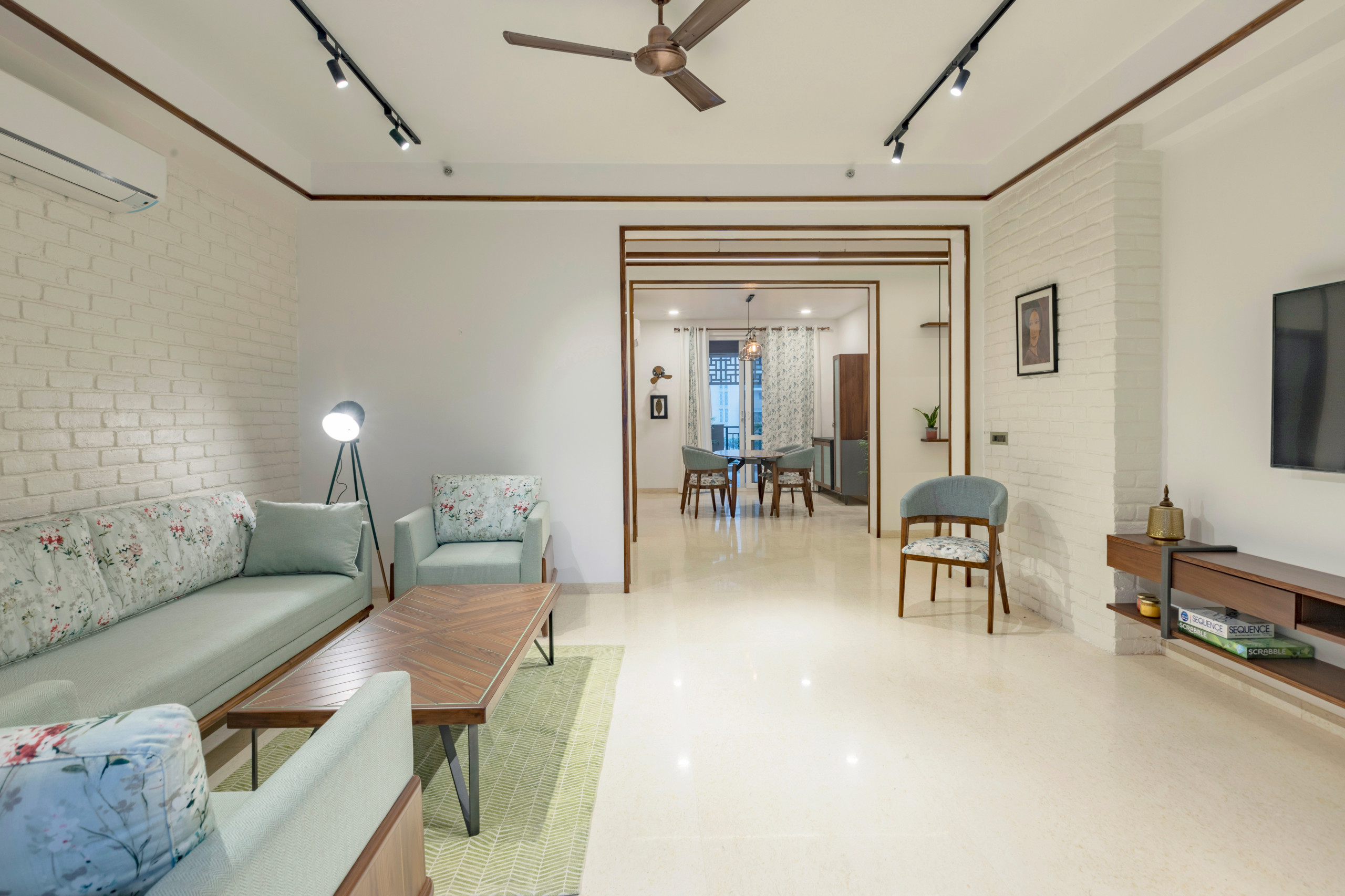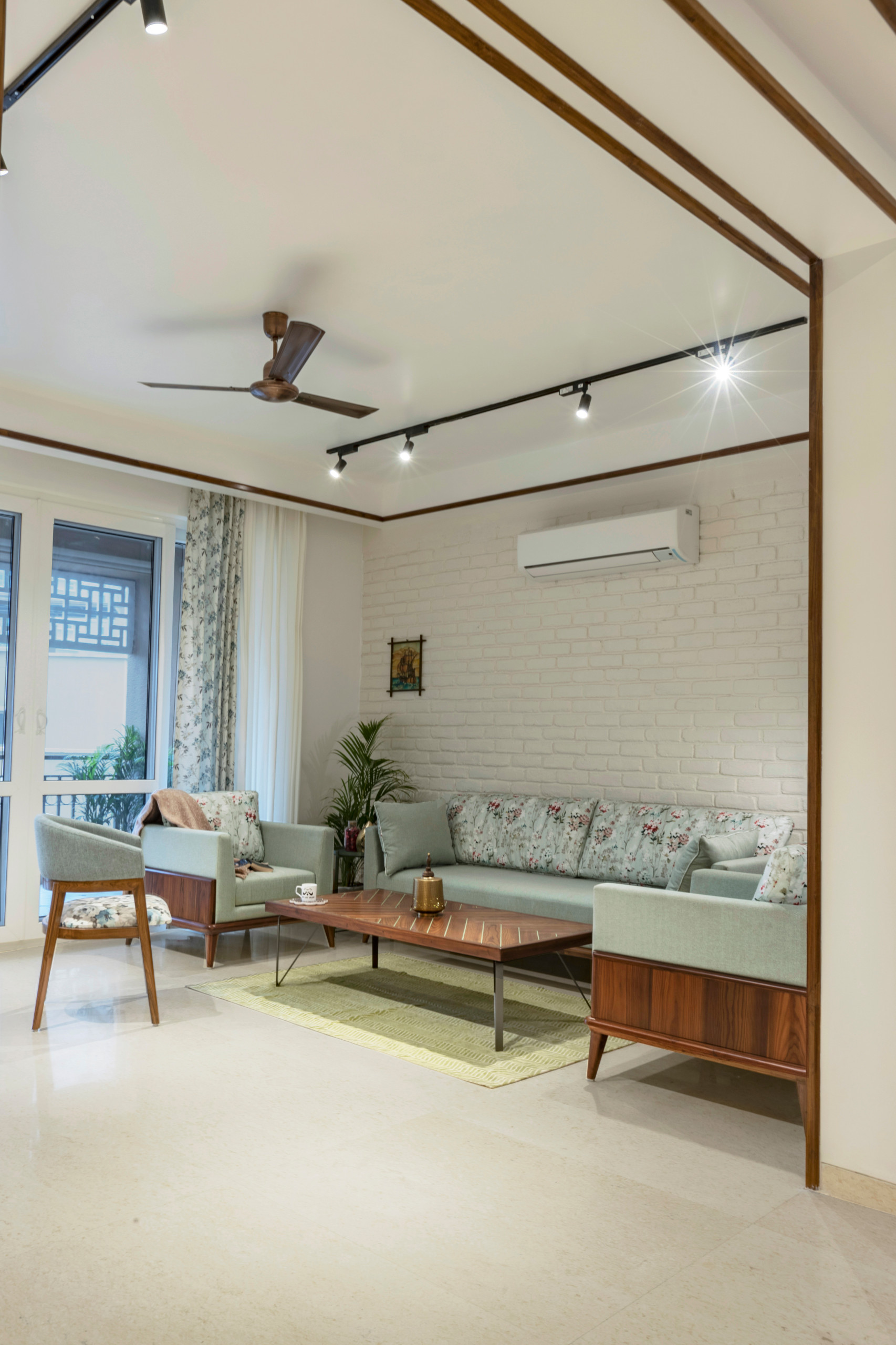 Linear patterns of wood add warmth and loads of personality to the living room. The exposed brick finish and textured white paint draw attention and complement the pastel hues of the couch. Glass doors sectionalise the balcony and allow natural light to fill the space.