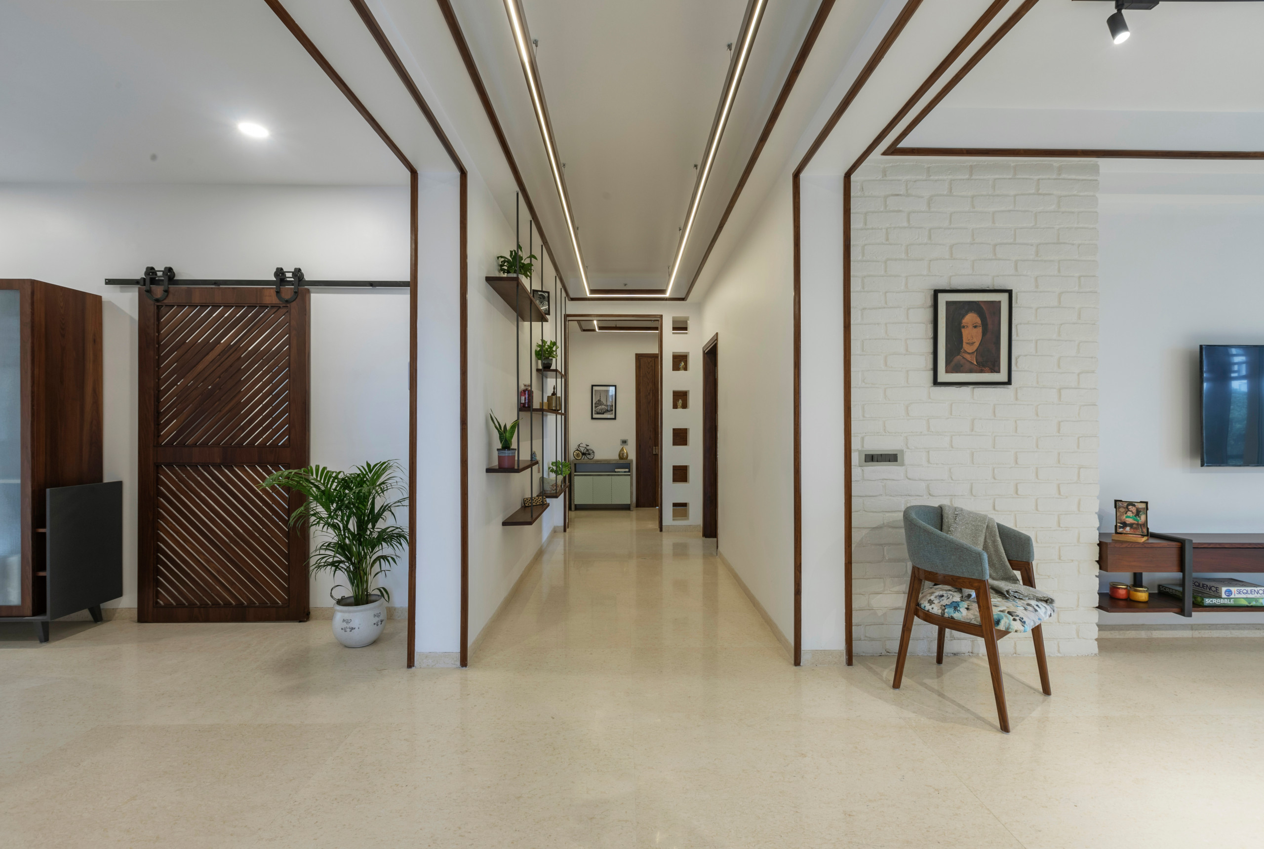 The main door opens into a foyer which leads into a passage. “The passage connects all the rooms together and is the first space visible upon entering the apartment. We added an array of hardwood display shelves that are suspended from the ceiling and a 30-feet-long suspended light in this area,” says Gupta.
