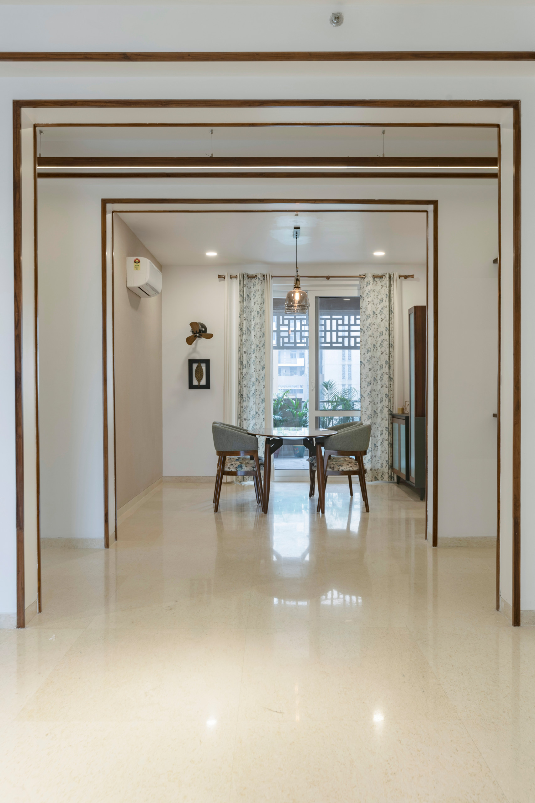 The passage leads to the living and dining areas that have a minimalist, contemporary and non-fussy decor. Thin strips of wood frame the doorways and border the ceiling, giving a sense of flow to the design narrative.
