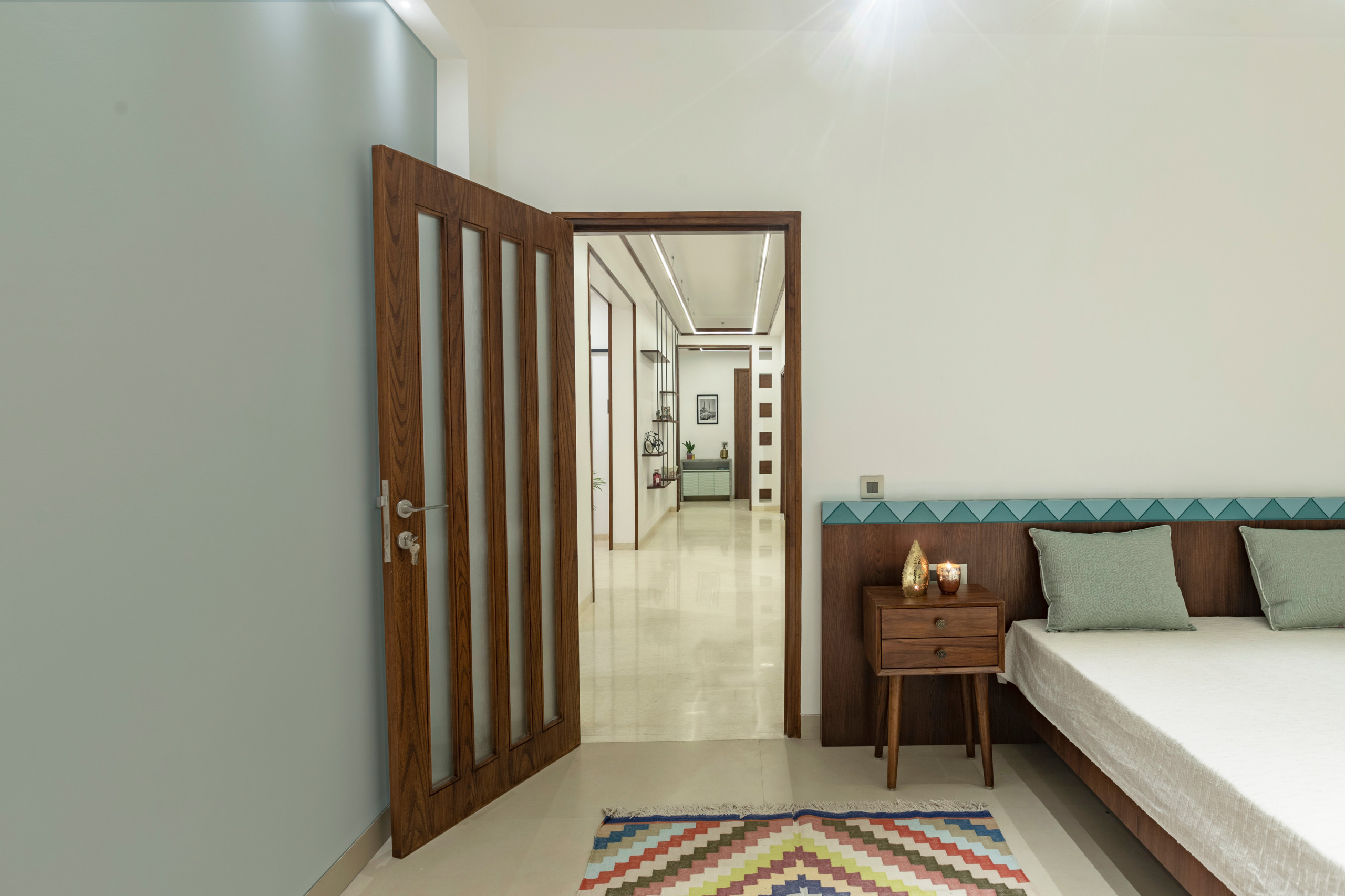 “The kids’ bedroom has a floating bed finished with a blue border on the headboard and the tiled flooring,” says Gupta. The door with battens gives continuity to the material palette of wood.