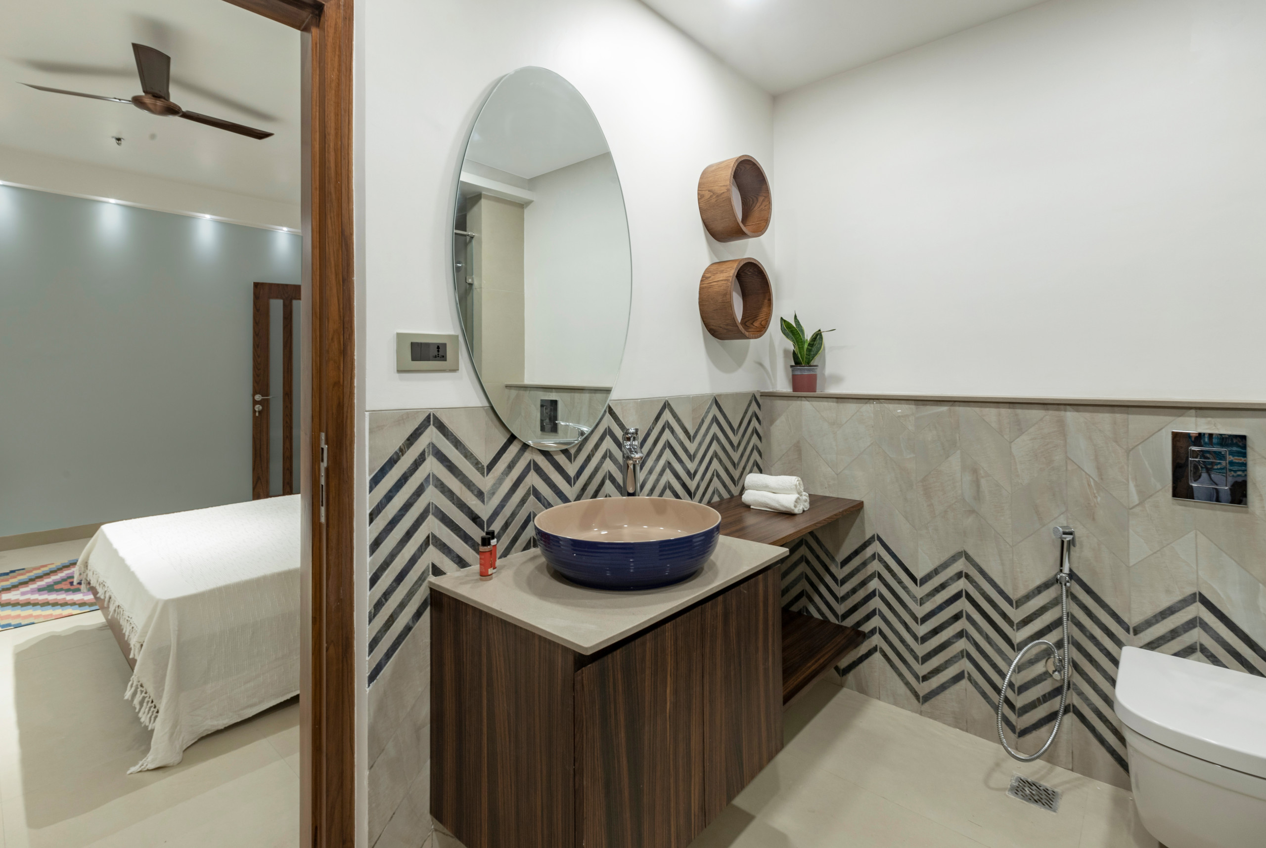 Patterned tiles and decorative wooden accessories on the wall give a playful vibe to this space. A dark-blue basin provides colourful relief from the earthy tones of greys and browns.