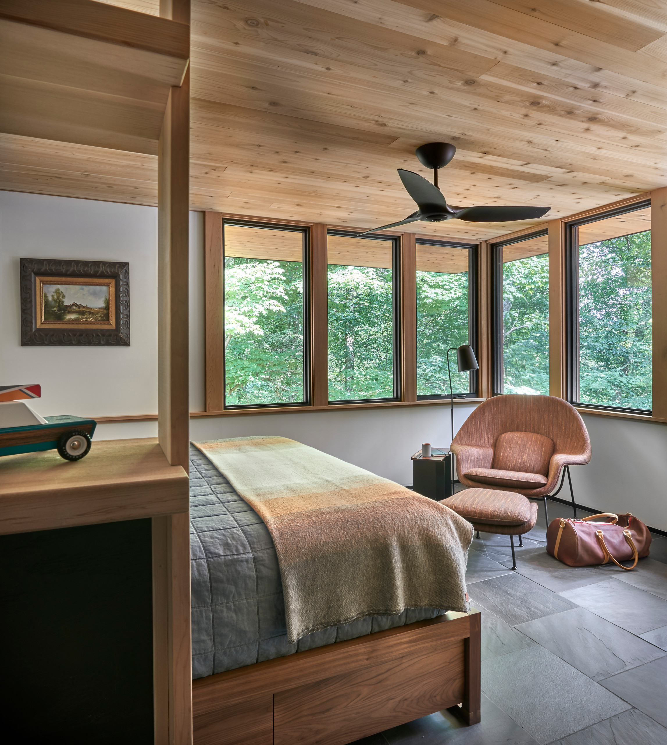 The upper-level main suite provides the owners with privacy when hosting weekend guests. Corner windows create a treehouse effect, while a door at the other end of the bedroom leads to a deck.