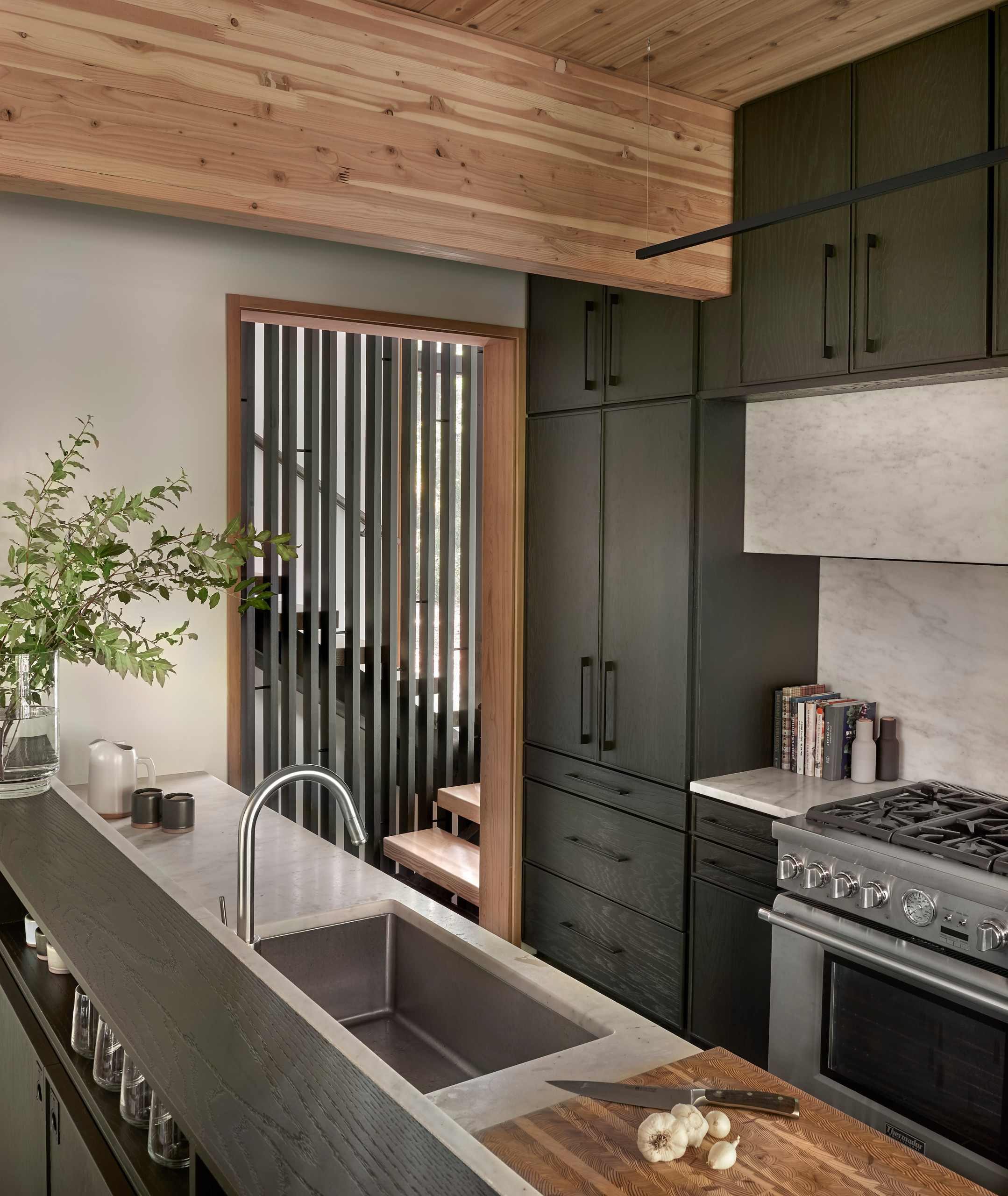 Though compact, the galley-style kitchen is well-equipped for the homeowners, who enjoy cooking and entertaining. Deep green cabinetry reflects the hues of the surrounding trees. Pale Vermont marble countertops, backsplash and hood cladding add contrast.
