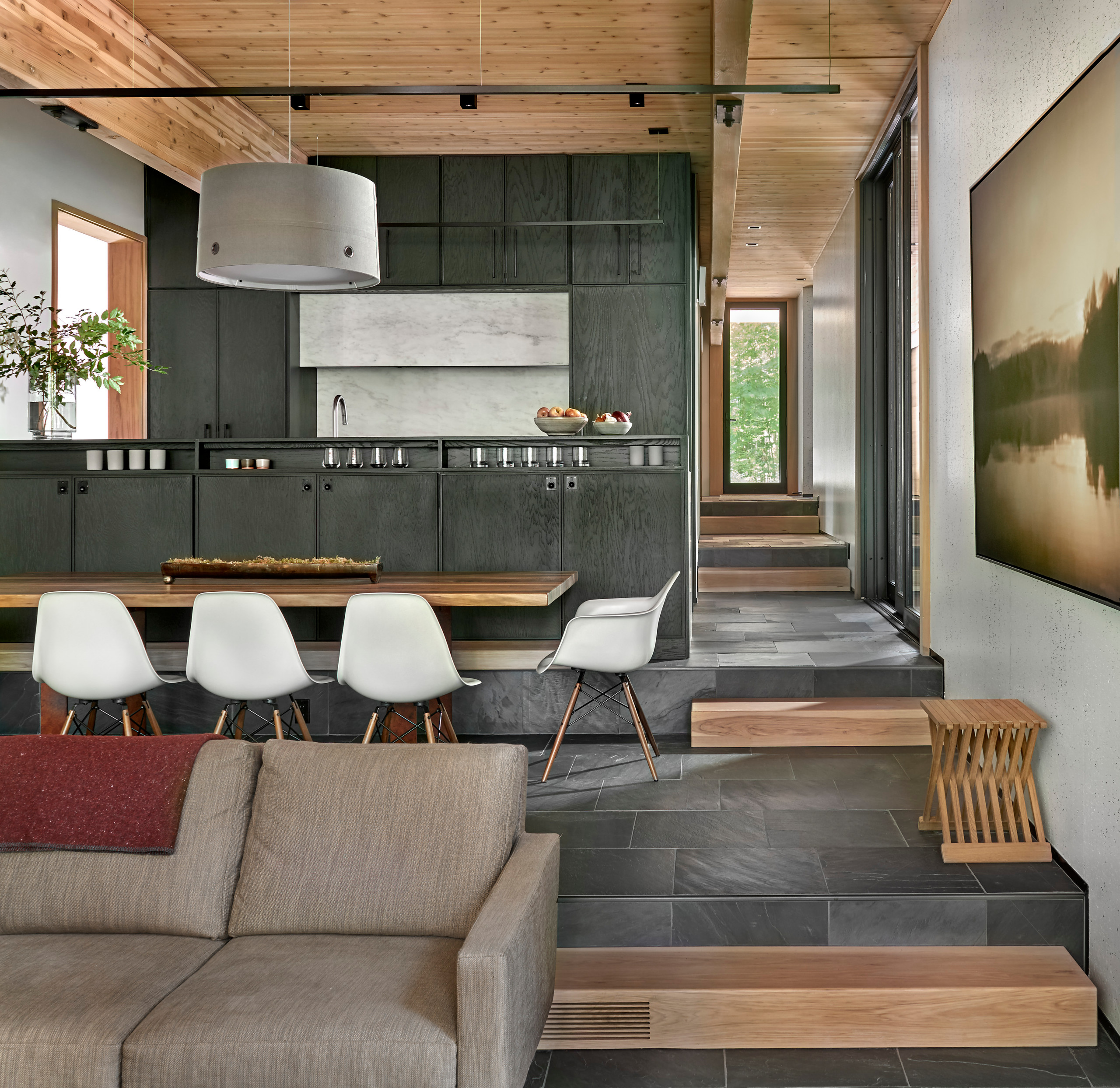 Natural materials such as the knotty cedar ceiling, shou sugi ban wall cladding, slate flooring and black steel fireplace surround provide a backdrop for pieces like the midcentury-inspired sofas, a sculptural wing chair and moss green tufted ottoman.