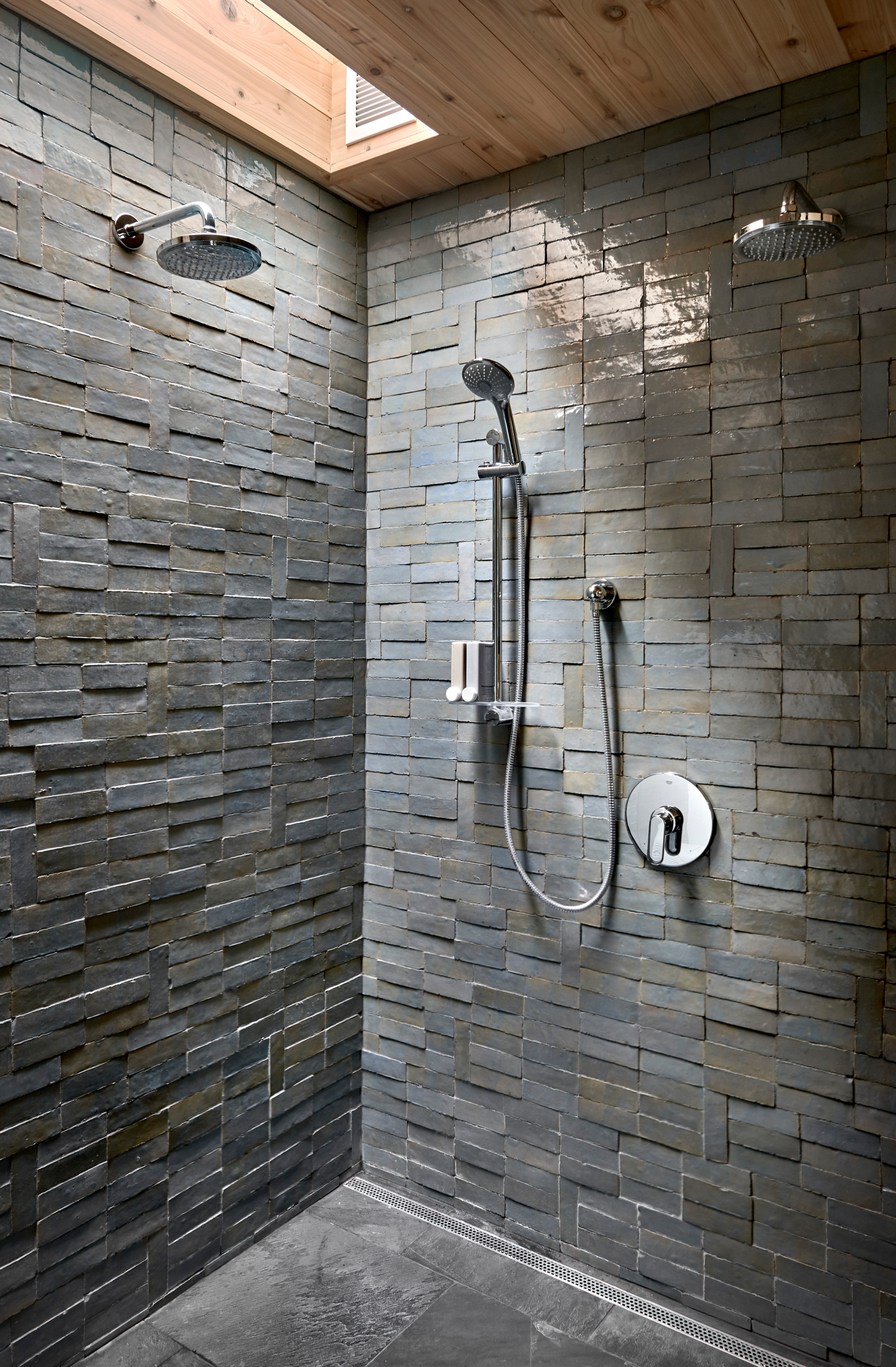 In the shower, a skylight reveals the textures and shadows of the glazed clay tile. “It’s like stepping into a limestone cavern,” Howe says.