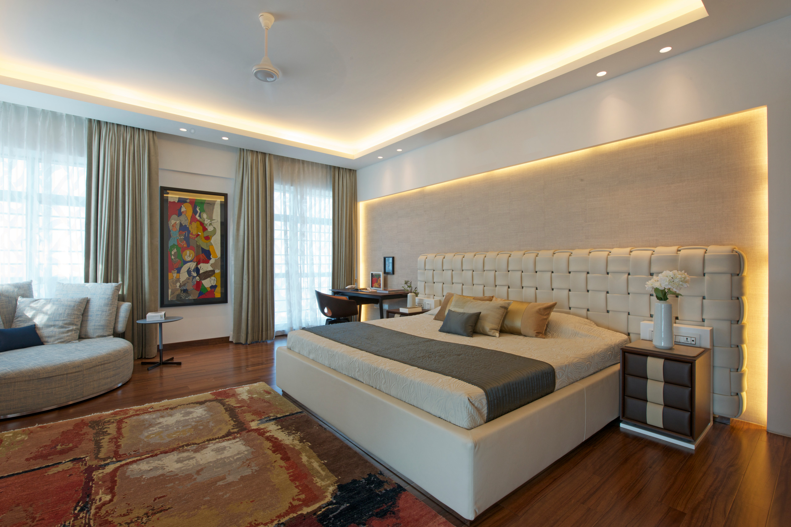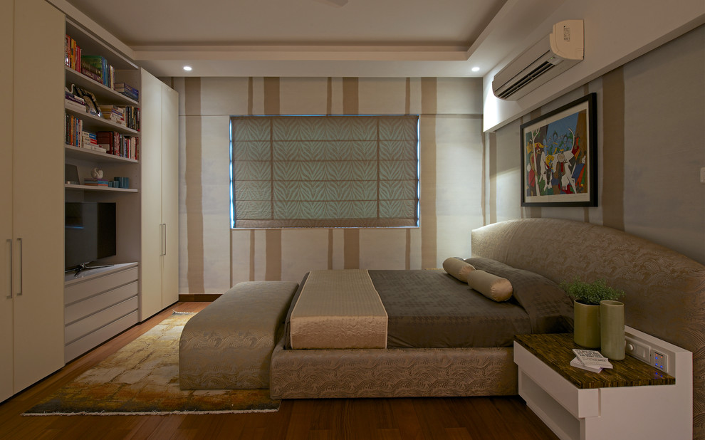 This second bedroom maintains uniformity with the rest of the house through its use of soft shades of beige. The upholstered bed and ottoman come together to blend contemporary and Indian influences. Storage has been cleverly crafted and built into the room.