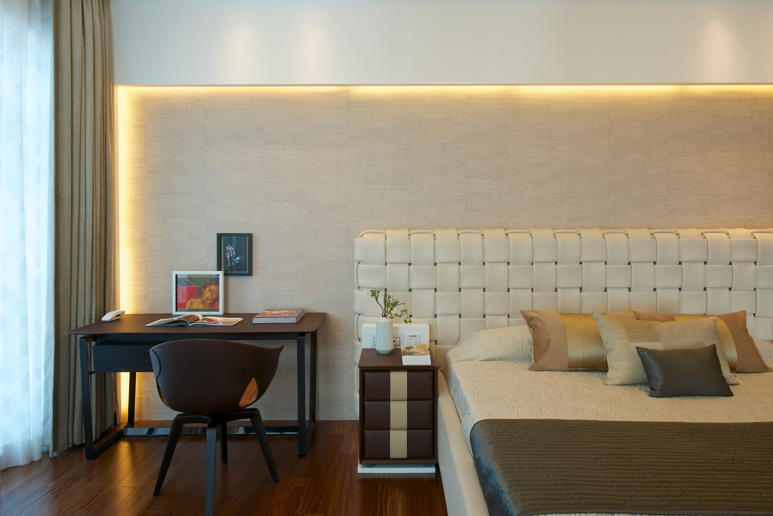 The master bedroom is a spacious area with the head rest of the bed contrasting softly with the side tables. The sleek bedroom design is complemented by a Fred and Ginger study table and chair.
