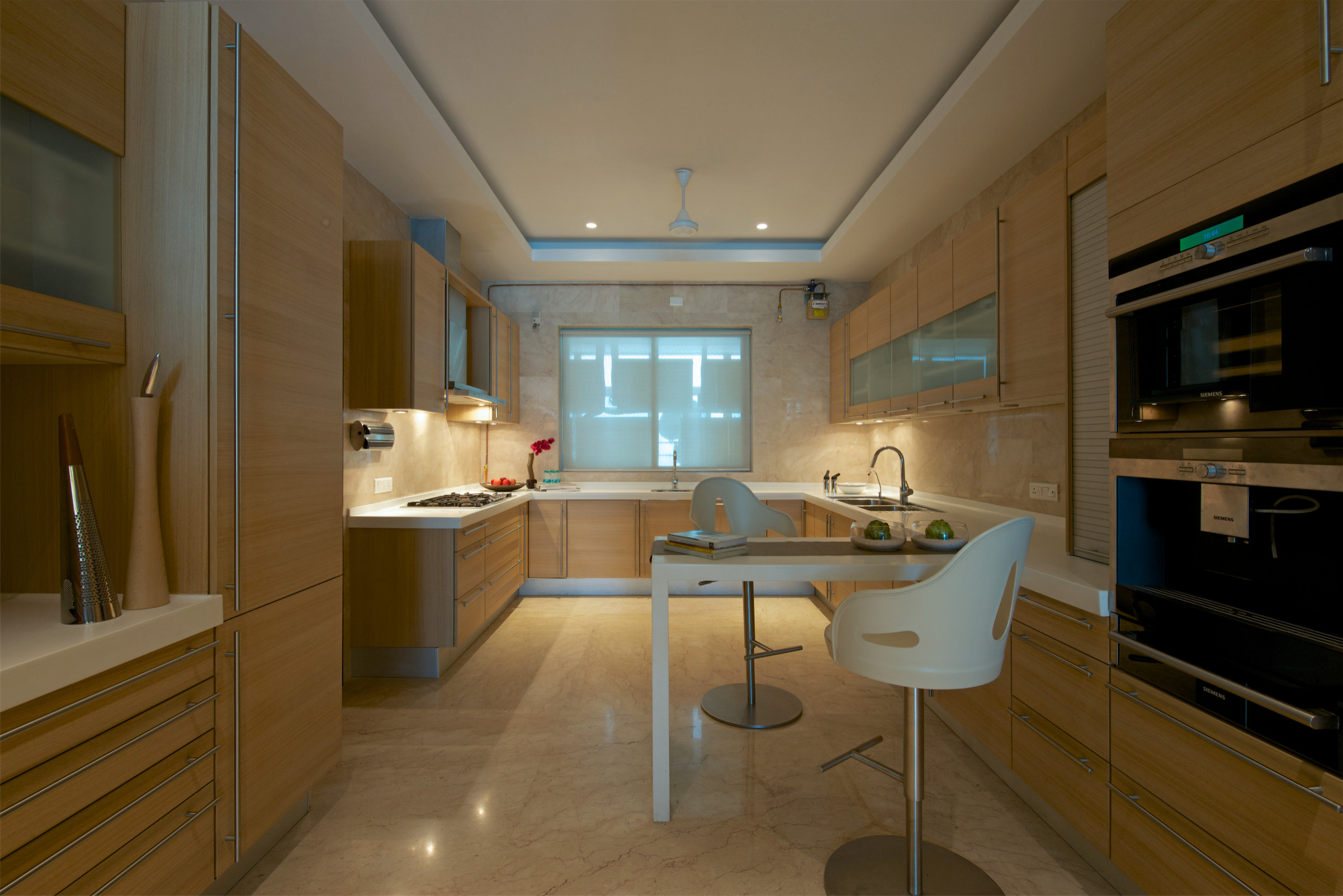 Like the rest of the house, the kitchen too shows a lightness of touch. It has been designed as an intimate yet spacious area, done up in shades of light beige. Contemporary cabinetry ensures that there’s minimal cluttering. A sleek countertop is set up in the middle of the space and acts as an informal meal counter.