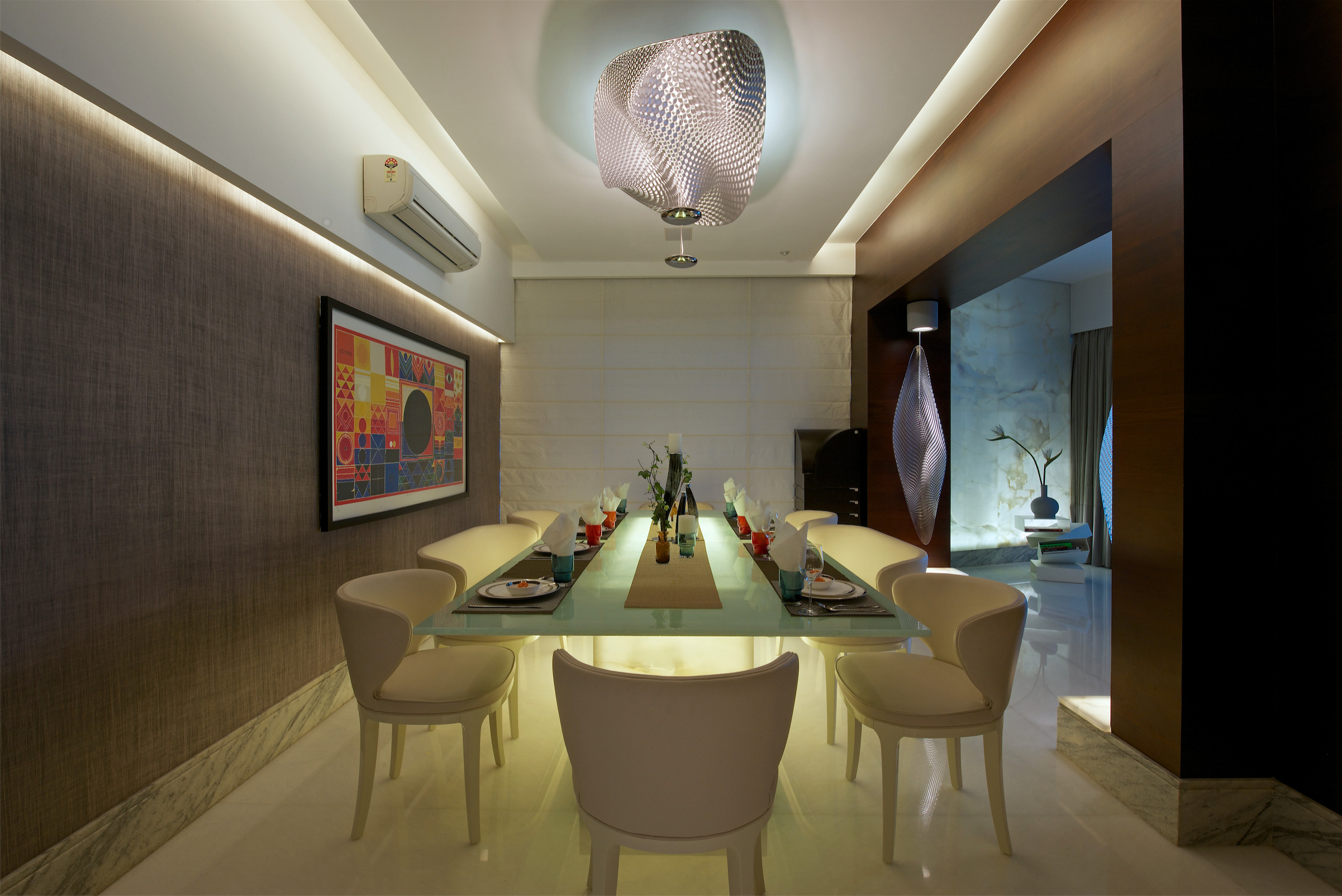 The bespoke dining table has been customised on site by ZZ Architects. This marble and glass table lights up from the base, “providing a sense of direction and elevated feel to the space,” says Krupa. To add a more intimate feel and warmth, the architects have used light leather seating, which brings in a sense of continuity from the living room.