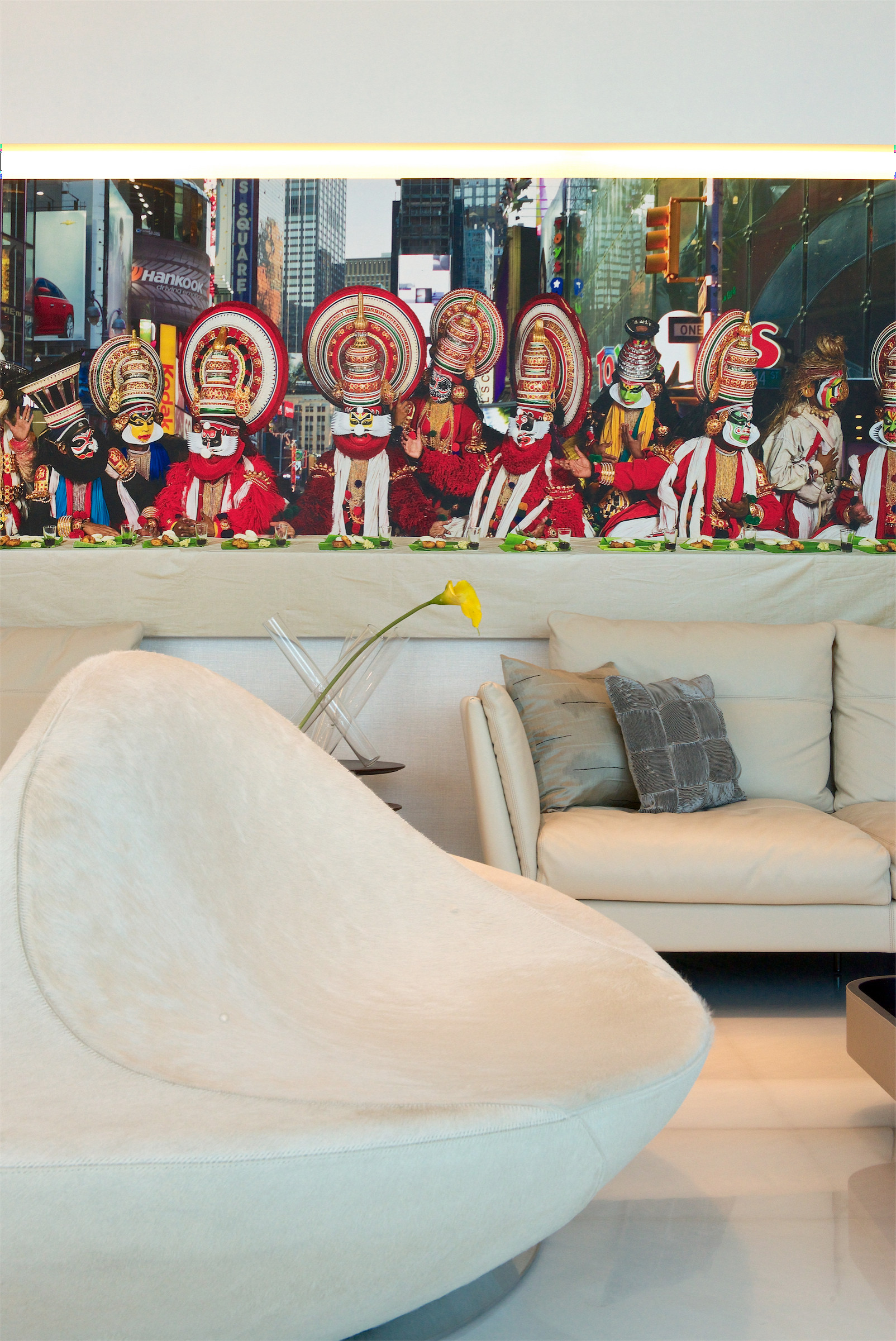 Another statement piece, the white face-chair adds an edge to the art-quotient residence as well as a good dose of quirk to the space.