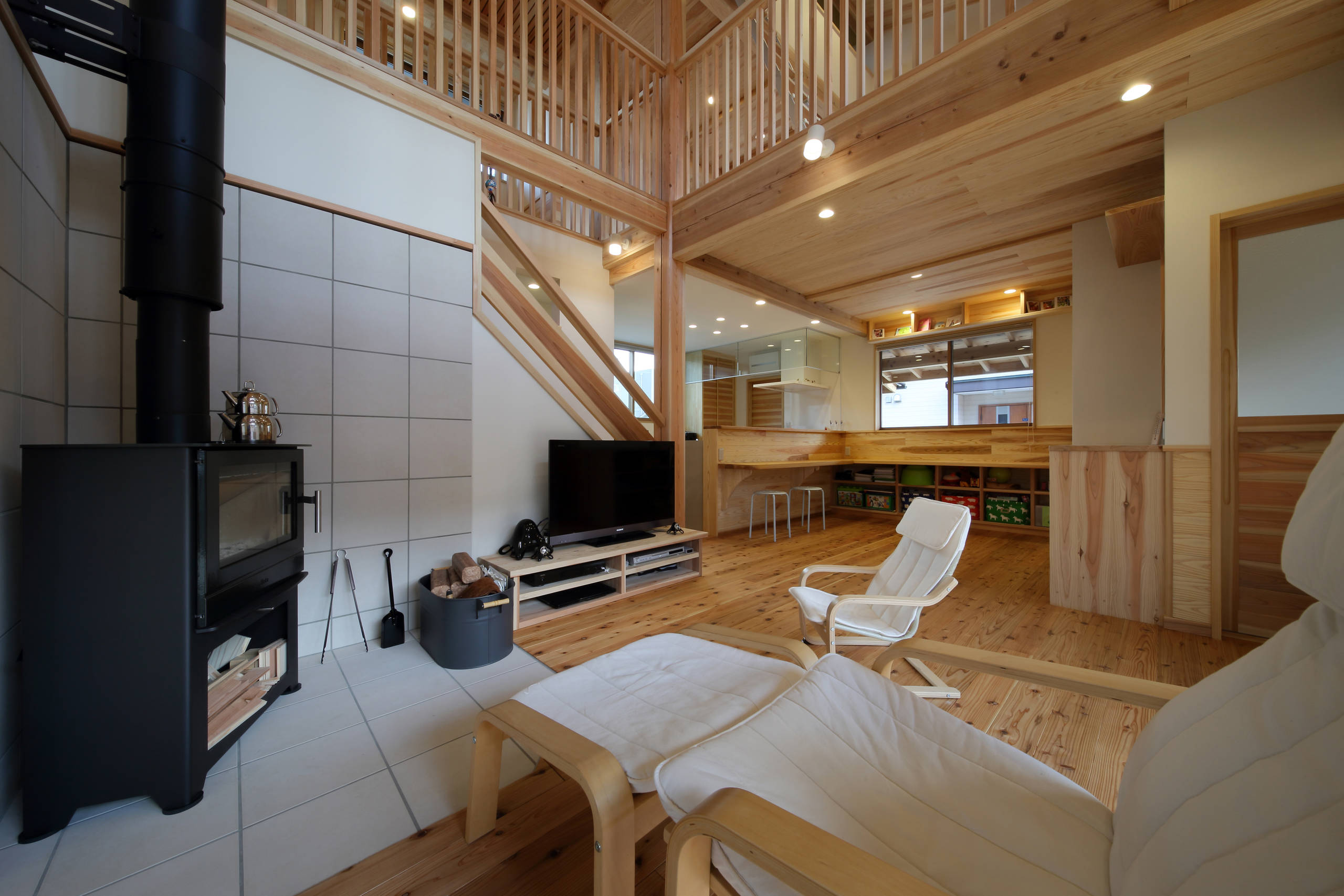 The wife requested a small alcove with tatami mats in this room, seen here on the left of the photo. The drawers underneath store the kids’ clothing.
