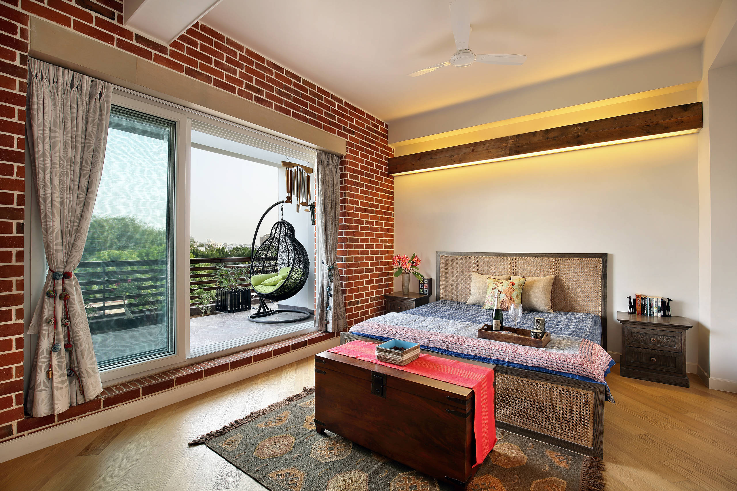 “We opted for pastel colours for the linen in the master bedroom to accentuate the brick wall,” explains Tejas. “The colours and patterns of the fabrics, the wooden chest at the end of the bed and the carved side tables were specifically chosen to cohesively create the ‘eclectic look’ in this space.”
