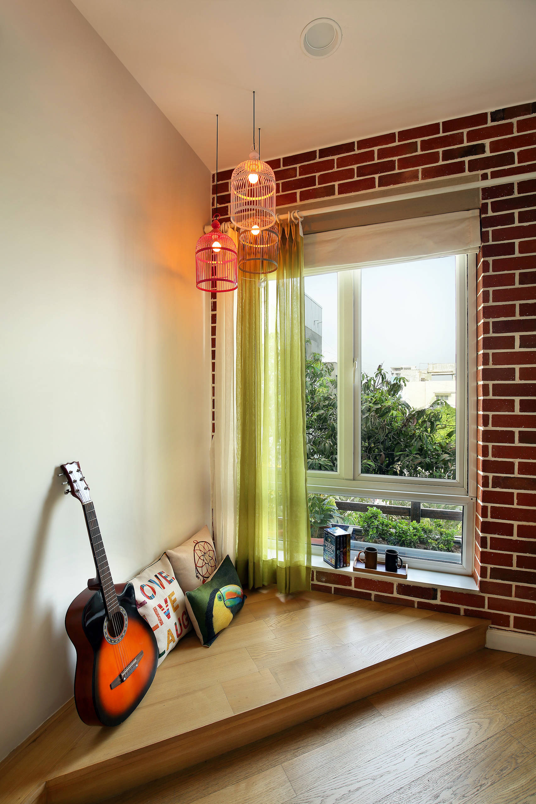 A small alcove is created in the corner of the room and styled with cushions, cage lights and a guitar.