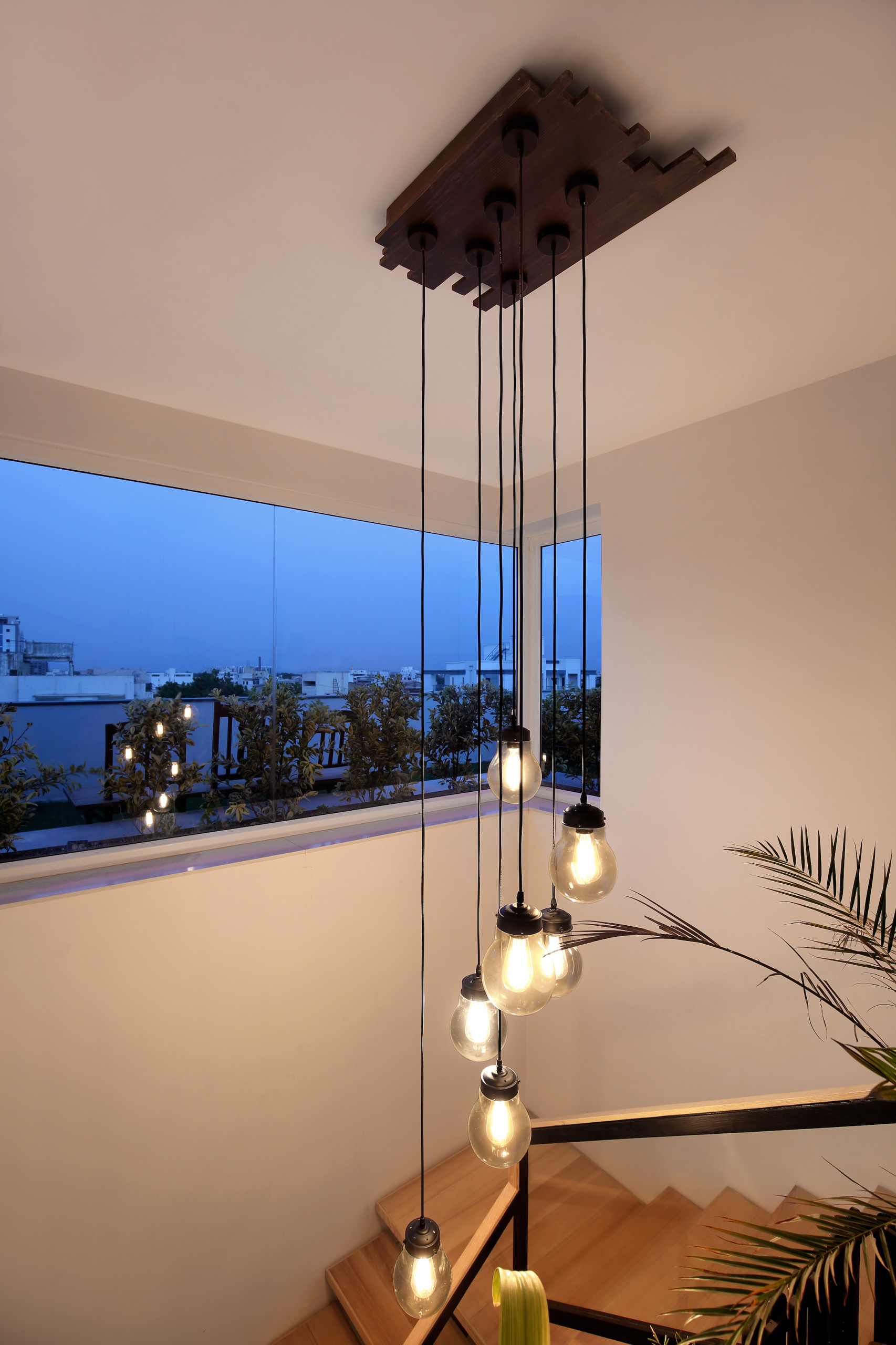 “To create a memorable visual as one ascends the stairs, we suspended a pendant drop light fixture from the ceiling,” says Tejas. This staircase leads to the second level which houses the entertainment room and a second outdoor terrace with a natural semi-carpet lawn.