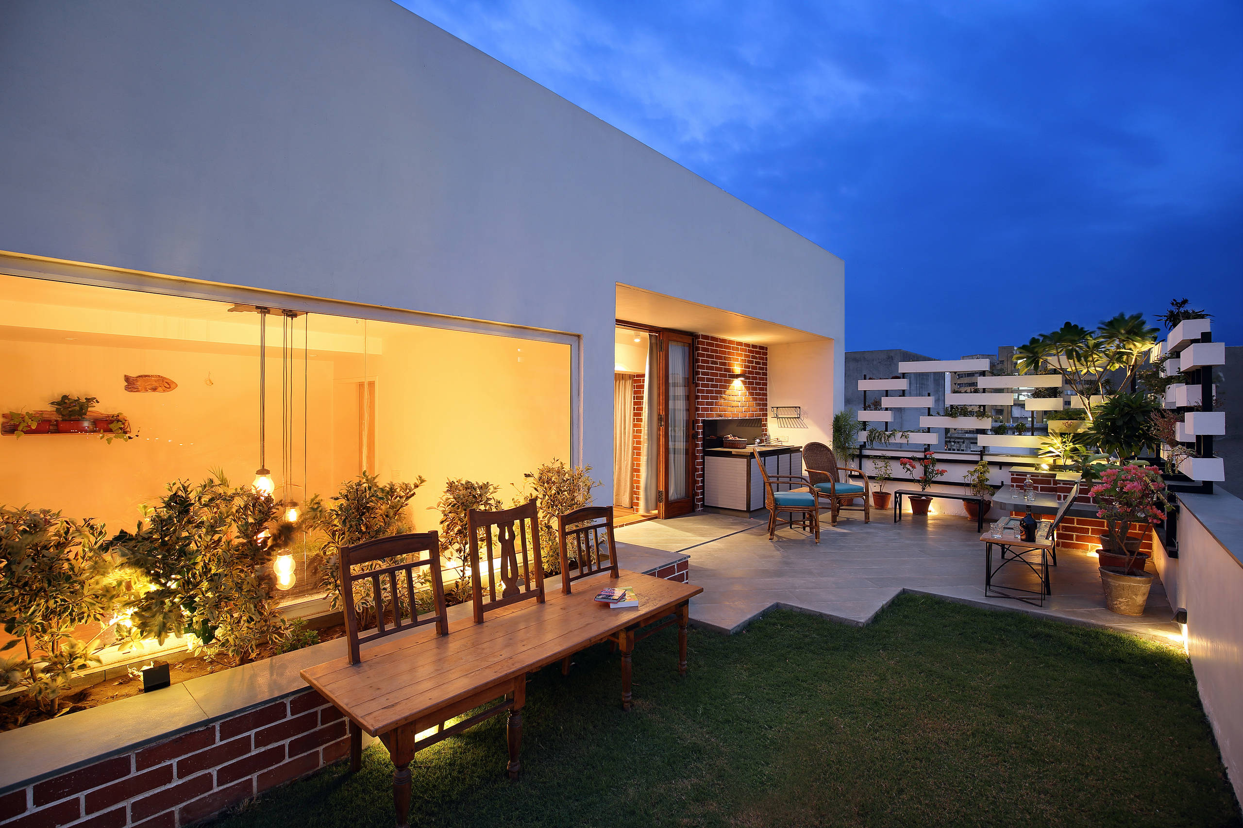 The terrace is decked up with a natural grass lawn. At the far end, the architects have created a screen from vertical planters to offer privacy from the adjacent commercial buildings. “We love recomposed boards, especially shera boards and decided to use them as planters on a fabricated skeleton. The idea was to build a screen that was not completely covered up. Since the homeowners love plants, it can also be used to grow seasonal flowers,” says Mona.