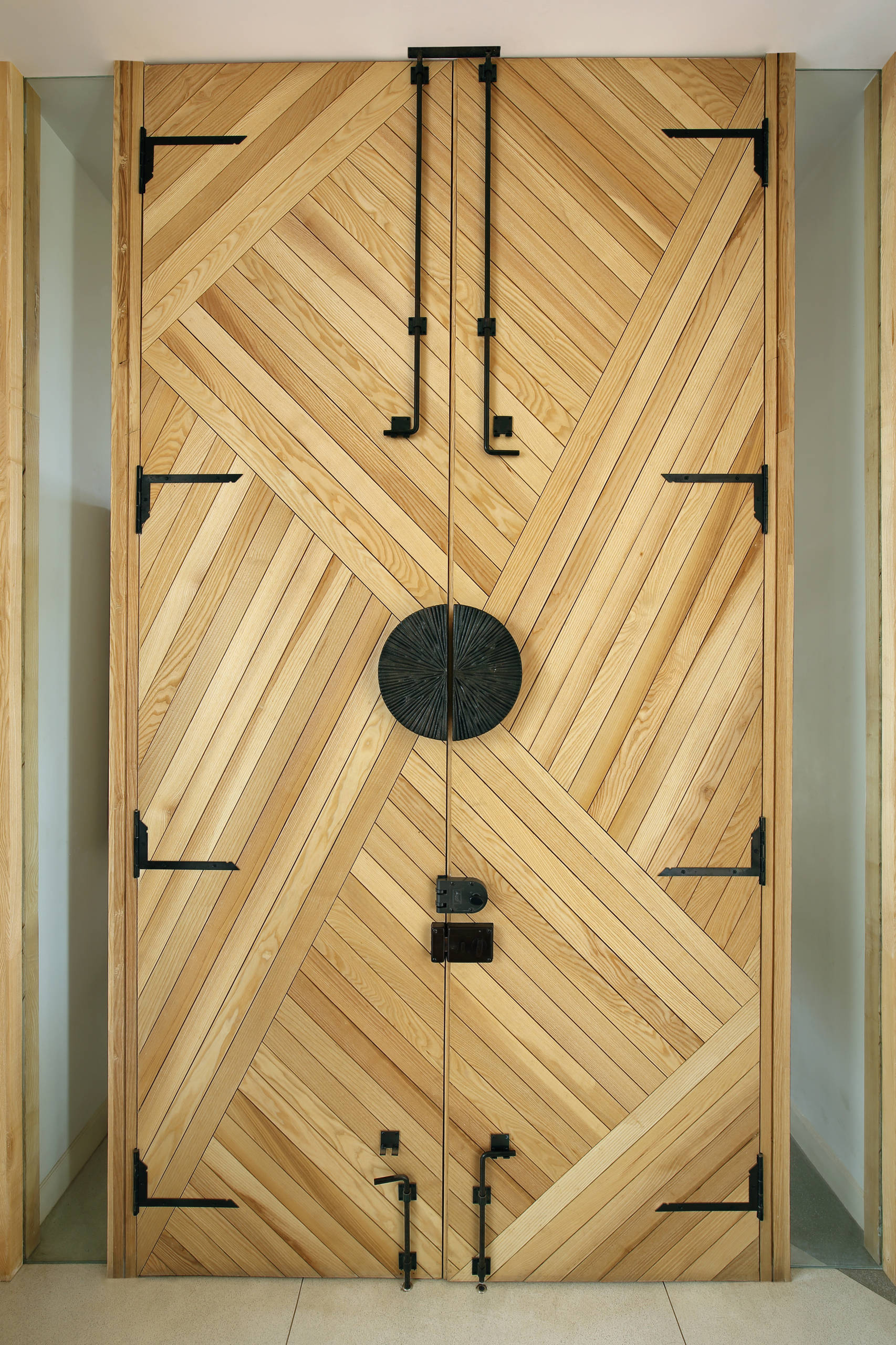 The terrazzo floor is custom-laid while other stones have been locally sourced. The colours chosen for the terrazzo floor are grey, white, blue and burnt orange, which in turn influenced the colour choices for the fabrics and materials used throughout the house.