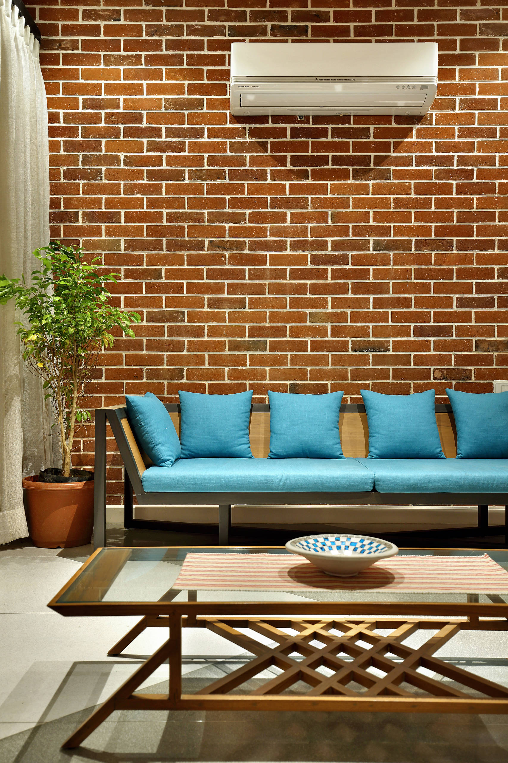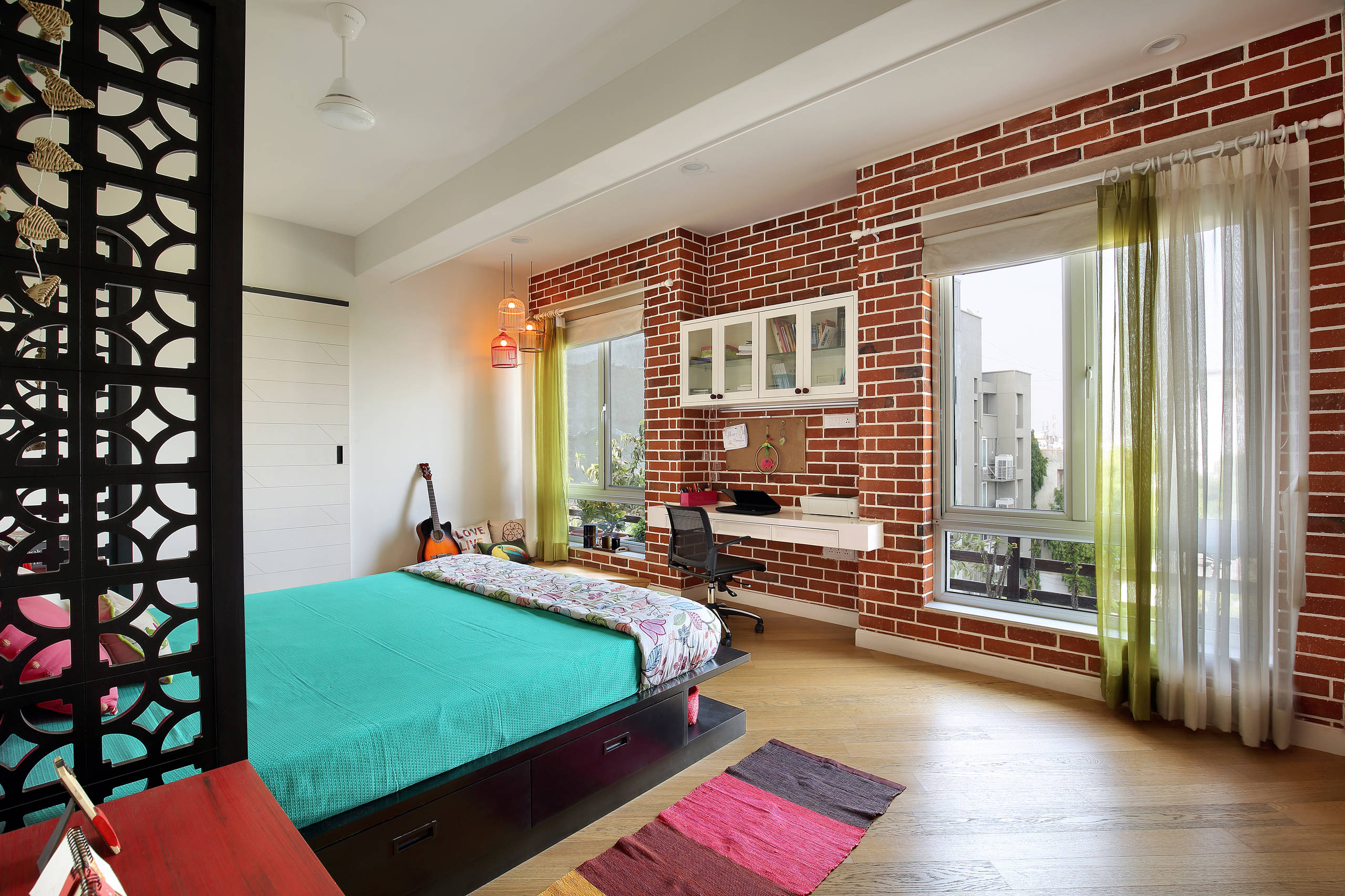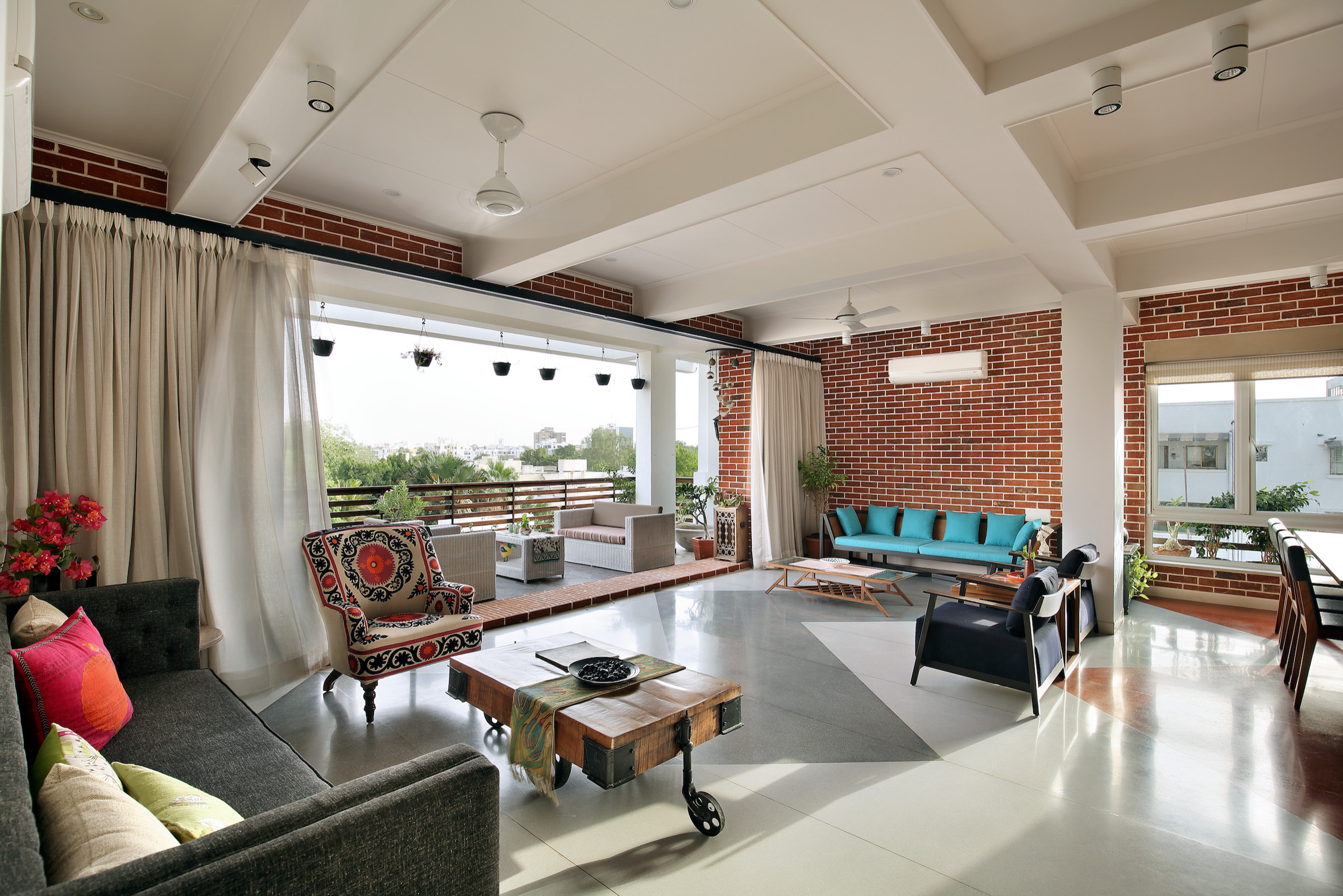 A brick wall and a vibrant design scheme unify spaces in this sprawling Vadodara apartment