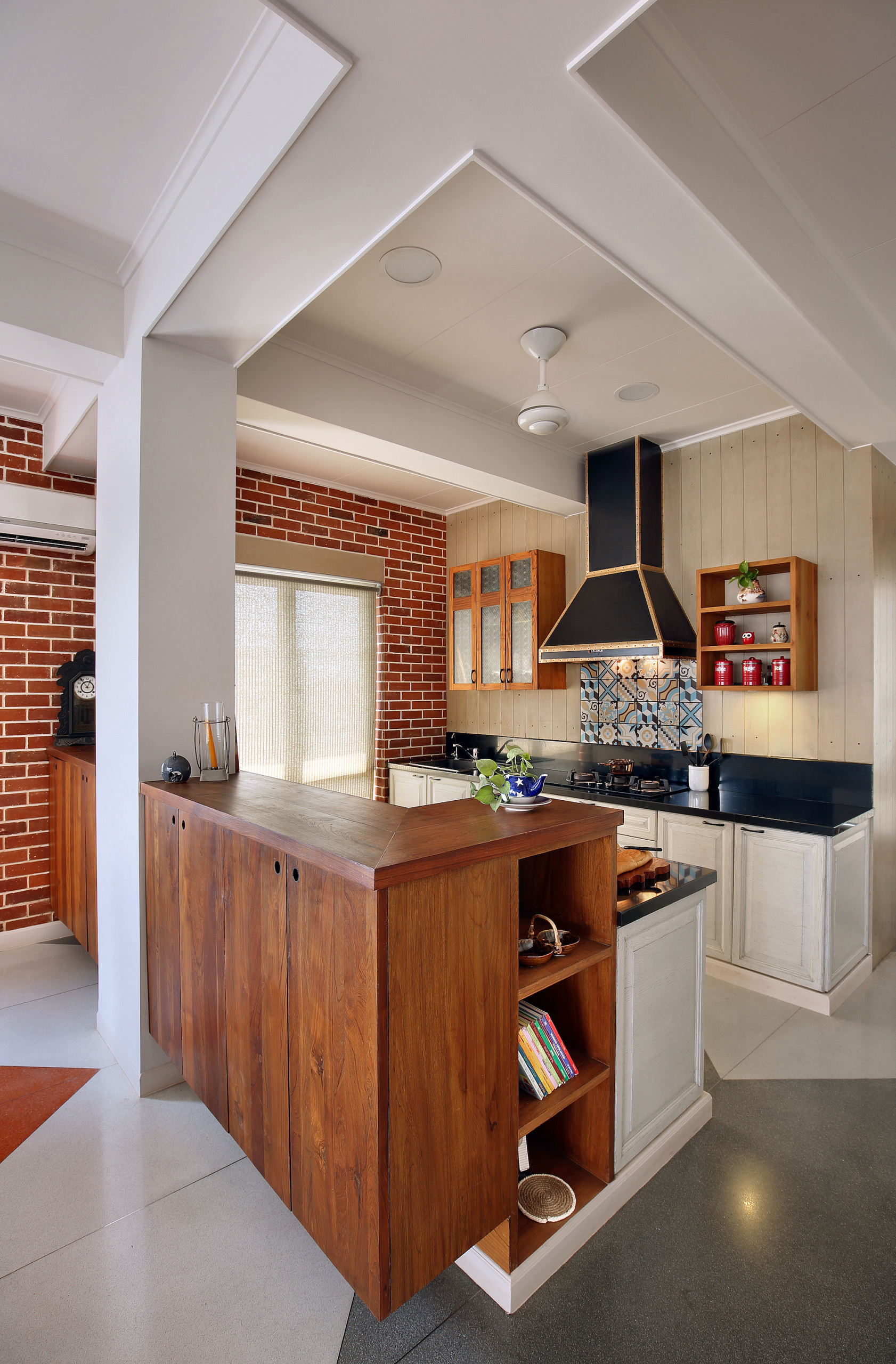 A patterned terrazzo floor was brought in to break the monotony of ‘the perpendicular’ created due to a grid formed by rigid walls and ceilings. “A brick perimeter wall along with the free and non-aligned placement of furniture further break up the grid, as well as hold the house together,” says Mona. “In addition, this pattern negated the residual edge issue along the walls that one usually faces when using a perpendicular grid.”