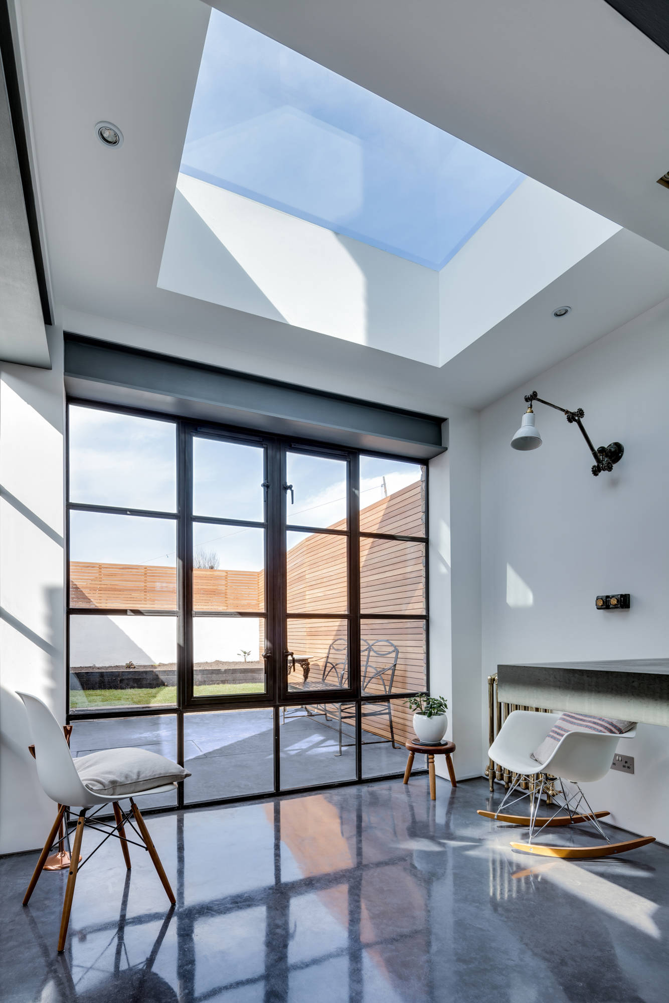 Think about the materials you use in your home and opt for ones that help reflect the light. Bright white walls and pale neutrals will bounce back daylight and enhance the calm, spacious feel a well-lit room provides. Here, the polished concrete floor also helps to rebound the sunlight.