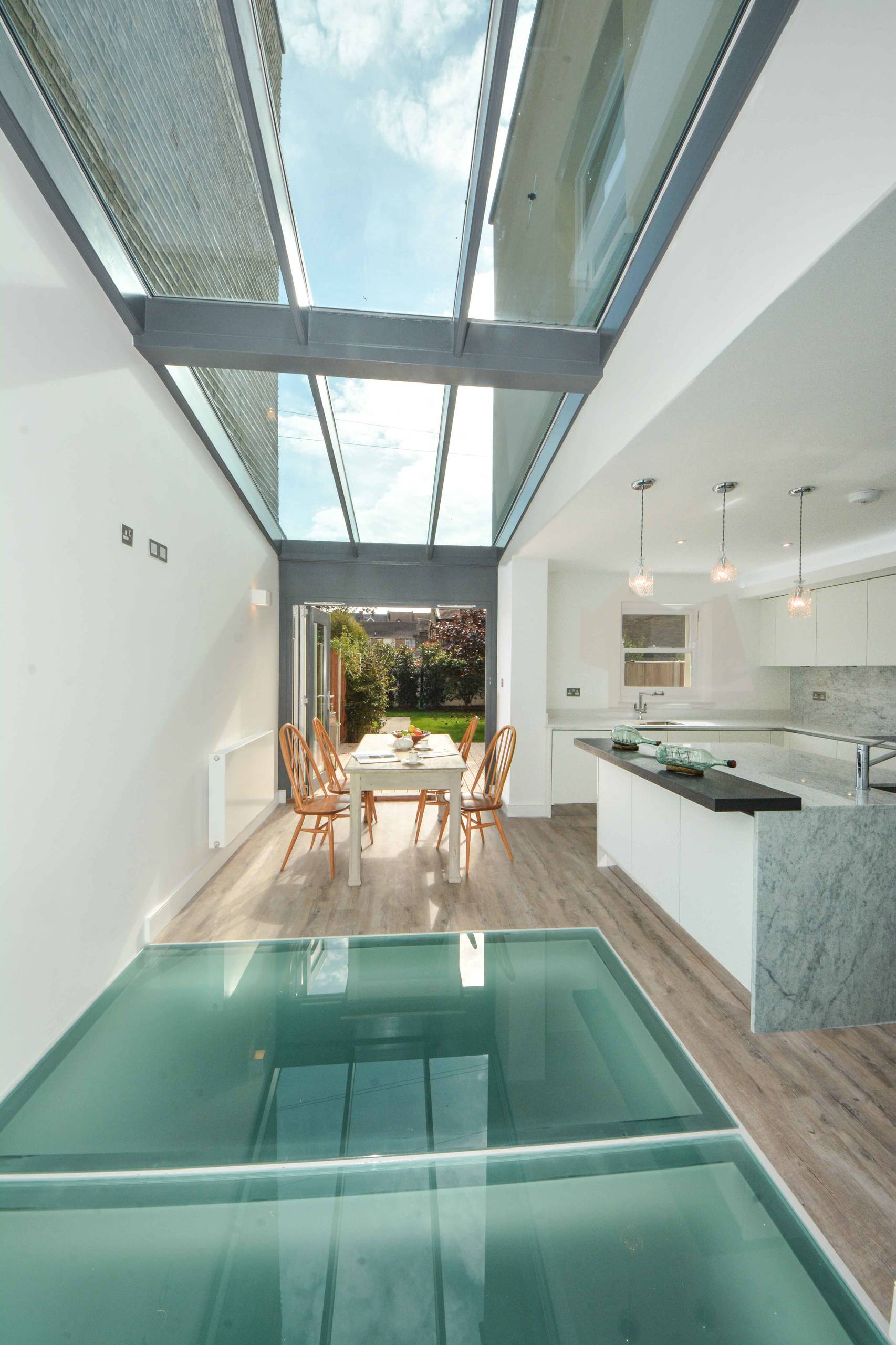 This large glass roof creates a wonderfully bright room. The glass floor also means that some of the light can be transferred to an otherwise dark basement below.