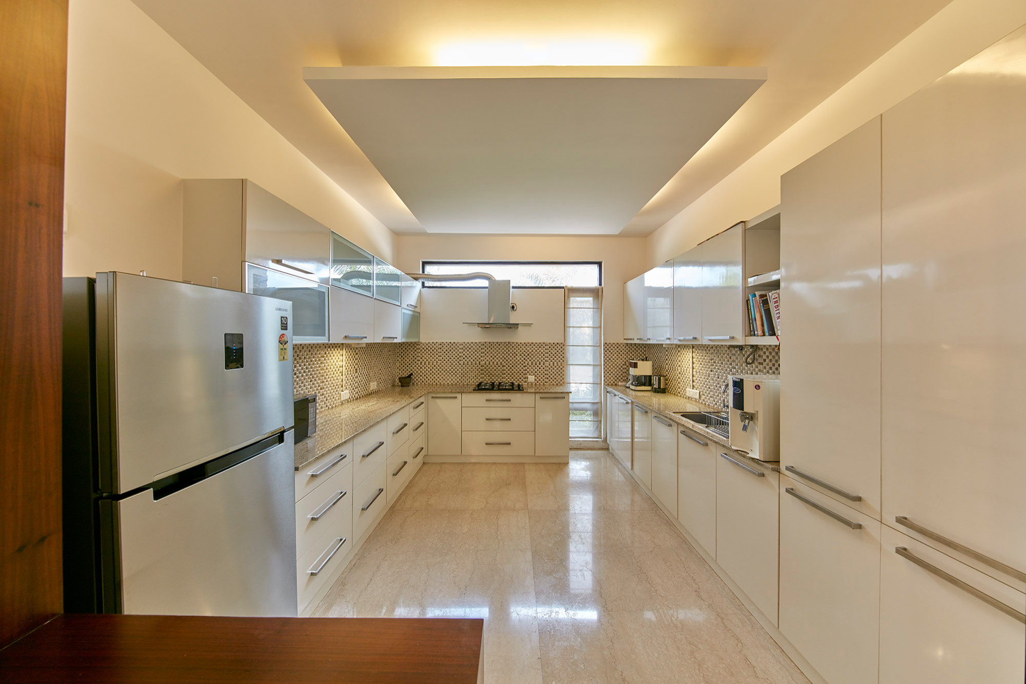 The parallel-counter kitchen accommodates the kitchen countertop and appliances on two parallel sides of the kitchen walls. Hence, this layout creates a passage down the entire length of the kitchen. The kitchen triangle can be easily achieved by dividing the kitchen into a wet zone that accommodates the cooktop and sink, and a dry zone that accommodates the refrigerator.