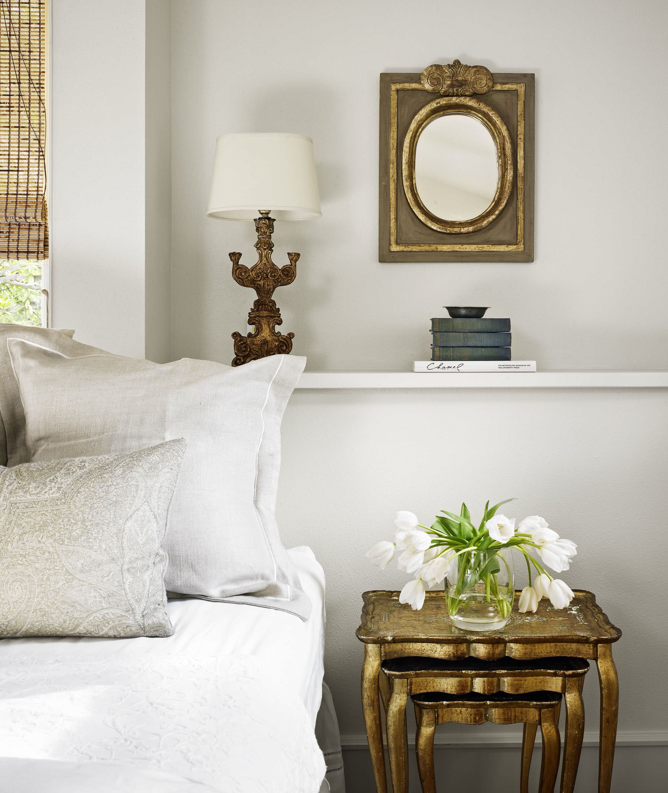 If you want old-world charm, go for an antique look. To achieve this, bring in statement pieces in dull gold and accessorise the room the way it has been done here with the nested side tables and the mirror. You can also consider an accent wall and finish it with a two-tone golden metallic paint.