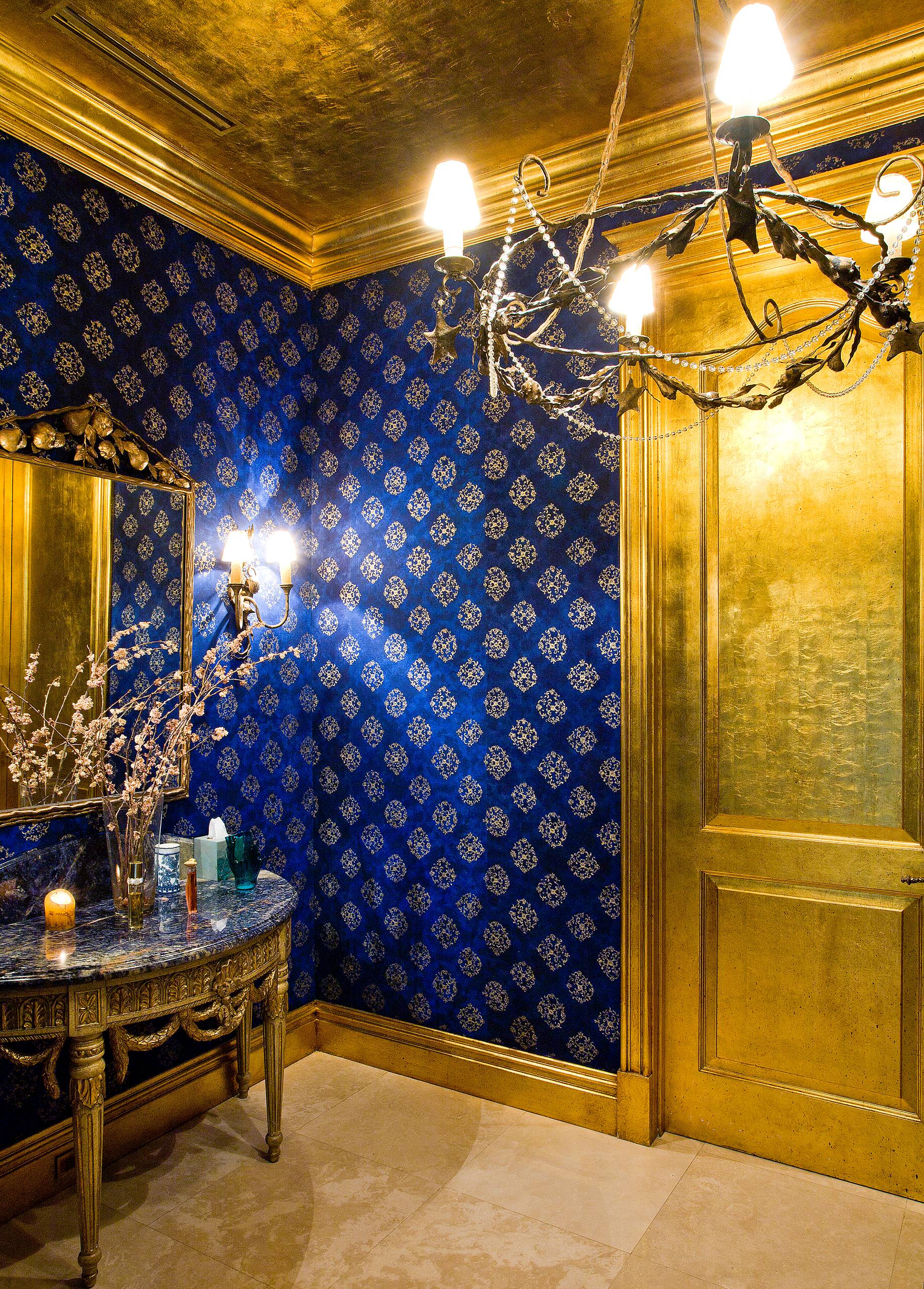 Or go over the top and add a good dose of the grandiose to your decor with metallic gold paint on the ceiling. In this space, gold is taken further onto the door and to the floor skirting. It’s hard to miss the intricately carved console table and the mirror frame, too. To balance and lift all that shine, royal-blue wallpaper with gold motifs completes the look.