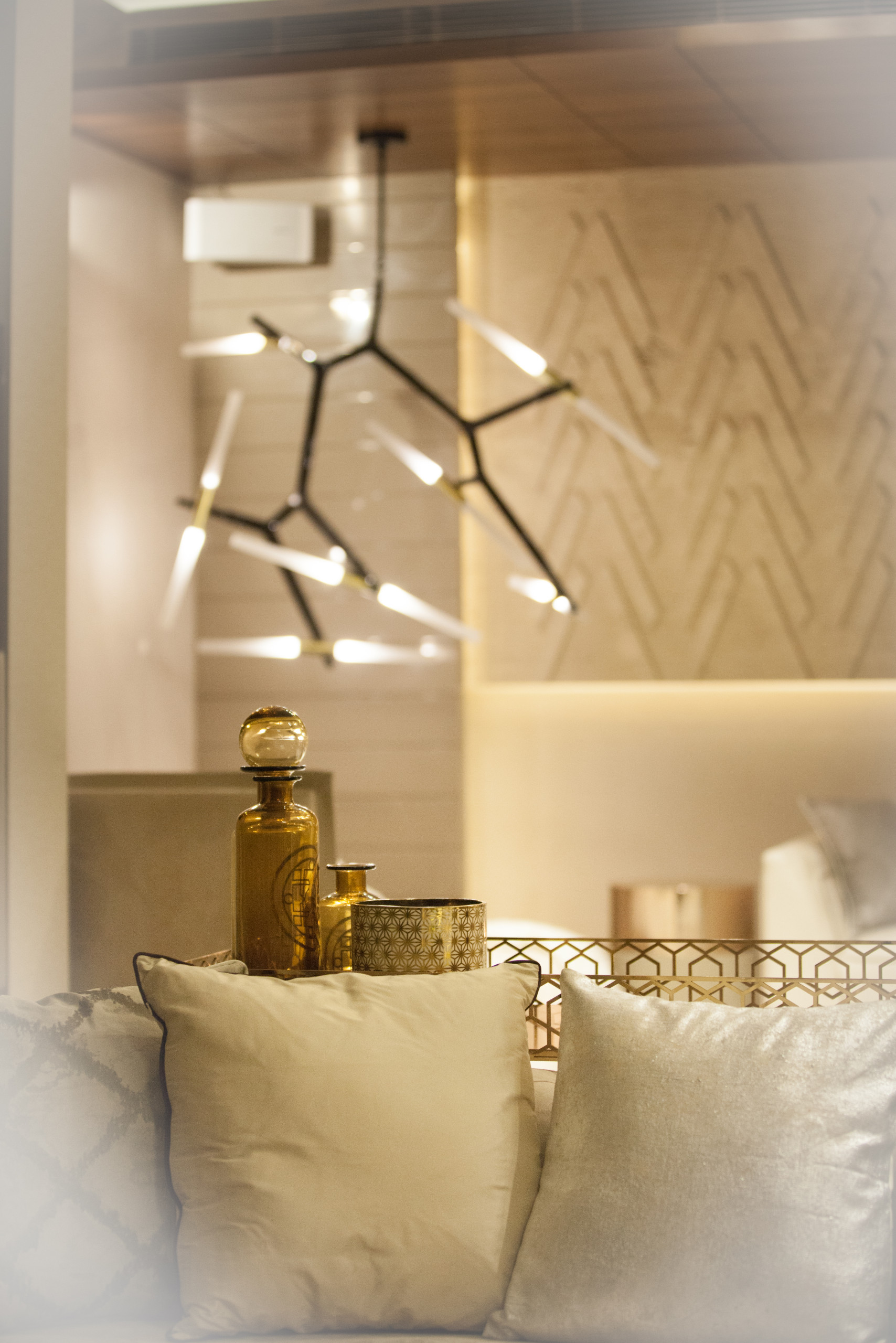 Tip: Gold polished motifs can be used on the bed headboard and on cabinetry; they go very well with dark walnut veneers.