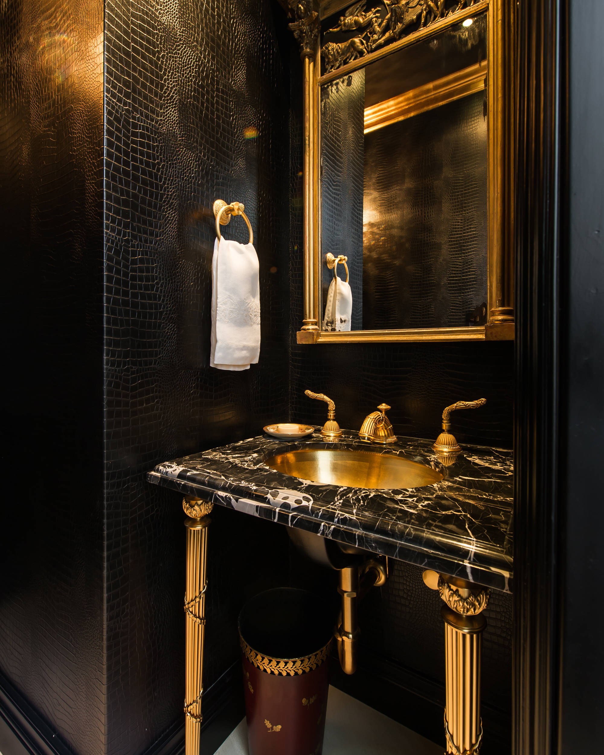 In this powder room, a black vanity is embellished with gold faucets and washbasin, exposed brass legs and a detailed mirror frame.