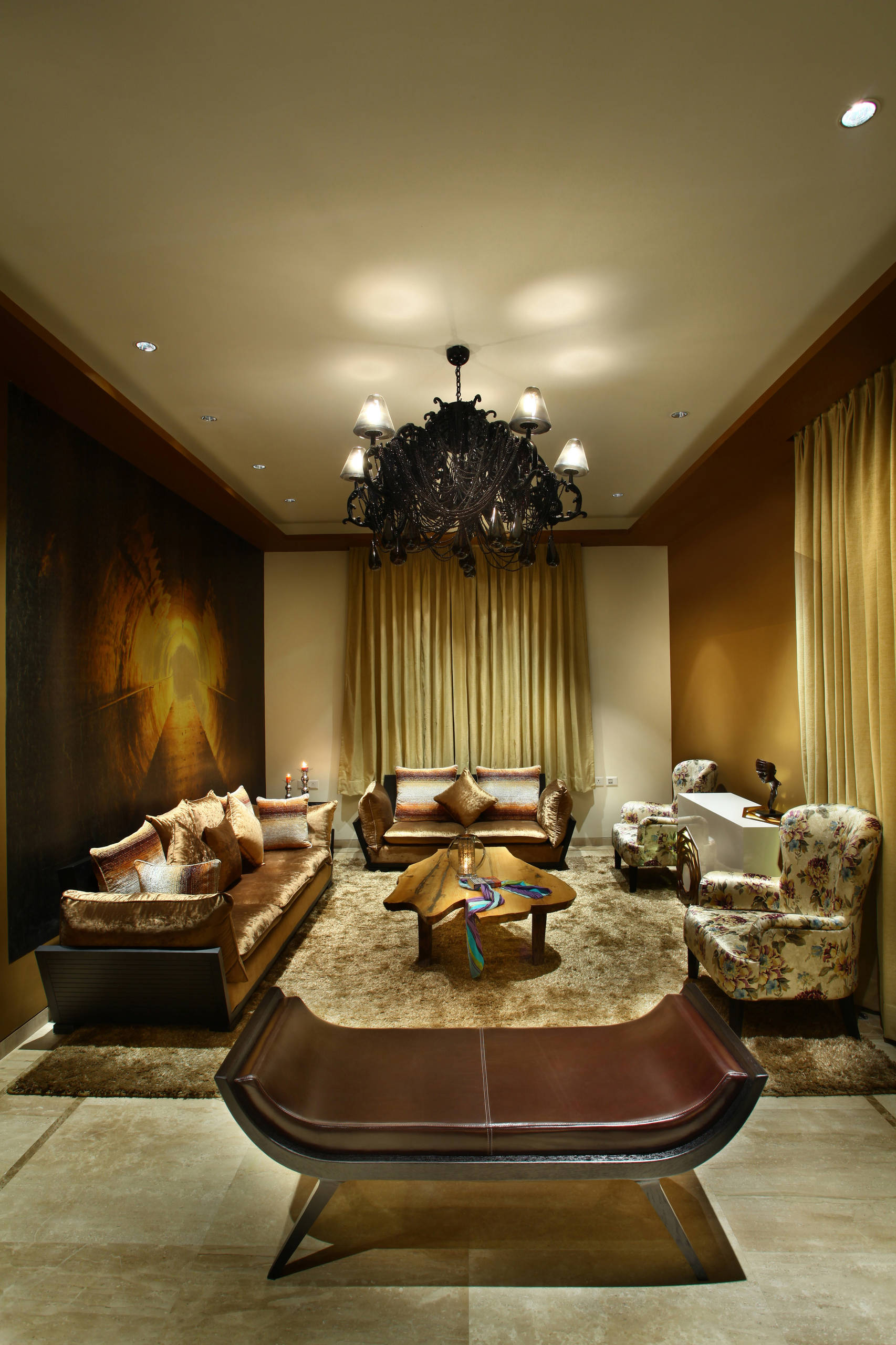 Introduce shades of gold in the upholstery, drapery, cushions or carpet. In this room, the soft furnishings in copper gold in front of the wall art contrast against the lighter drapes and carpet to give a rich, layered depth to the room. It’s important to strike the right balance so that the golden hues look elegant and eclectic and not gaudy. Practise restraint; in this case the use of browns anchor the shine.