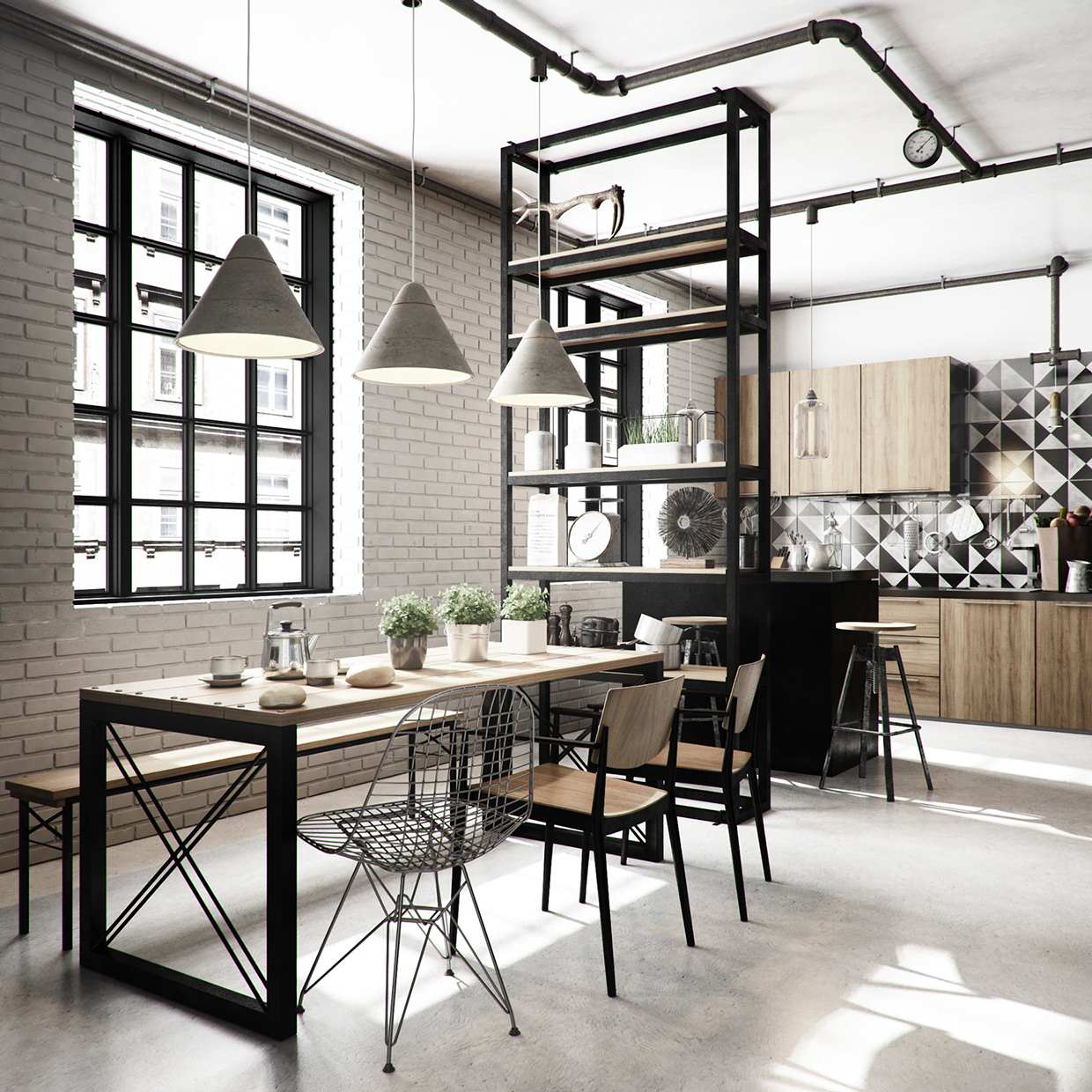 Industrial as a style is raw in its essence and unafraid to show its basic functional elements. Pipes, exhaust vents, old structural beams are all embraced instead of being hidden.
