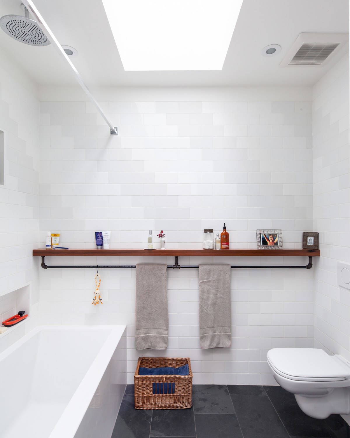 In the washroom, use pipes inside of towel or curtain rods. Opt for wired racks, metal freestanding tubs and even old-school metal buckets like those used in rural India before the era of plastic.