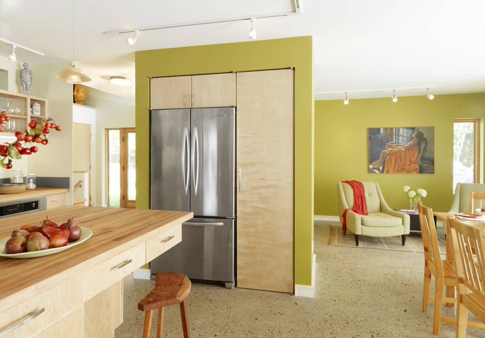 Cabinets and a refrigerator sandwiched within stud walls create a clean and contemporary look here. The cabinets were probably furred out within the walls.