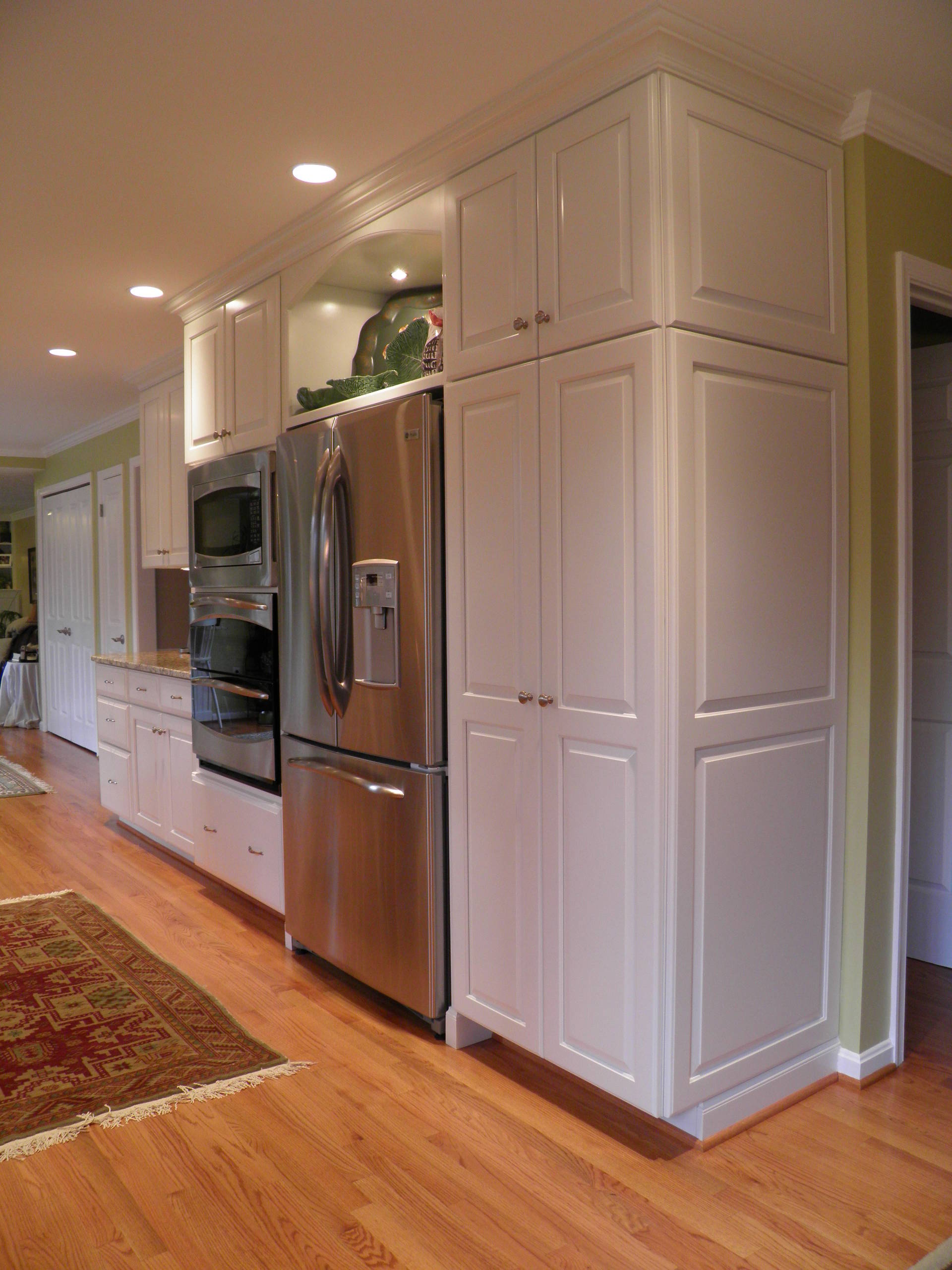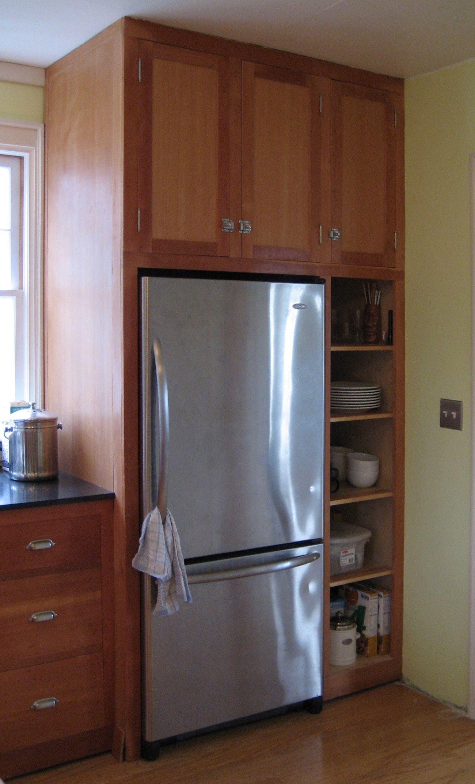 On the end is a tall open cabinet that creates an interesting visual display as one enters the kitchen. Note that this cabinet is actually pulled back a few inches from the refrigerator depth, so it continues the stepped look and also makes that corner a little less intrusive.