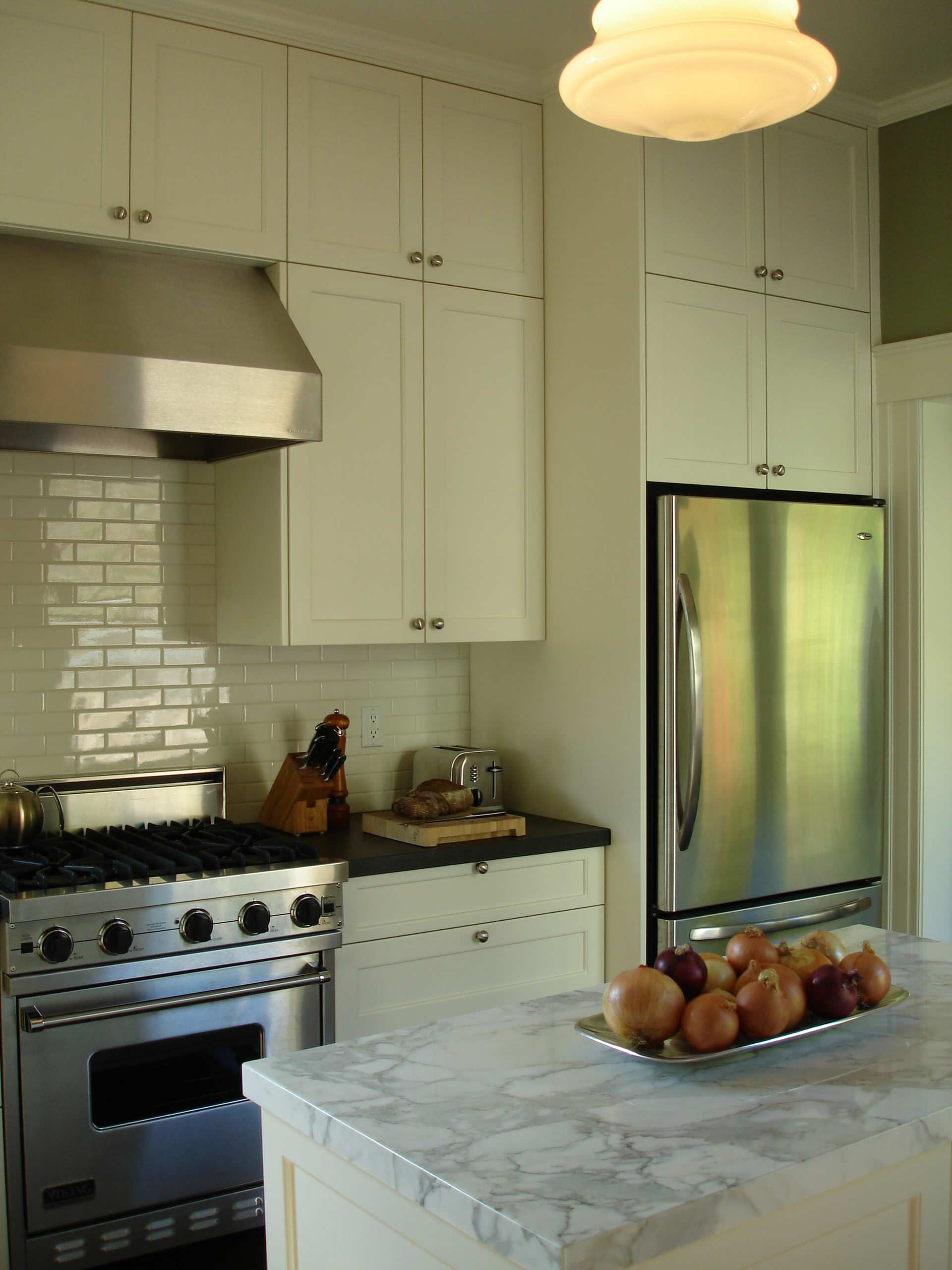 Here is another kitchen where deeper cabinets accommodate the greater depth of a freestanding unit. This refrigerator is a bottom-freezer model.